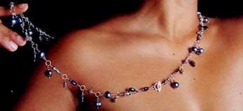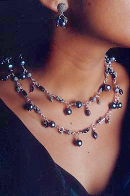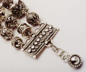 In addition to silver Bali beads, she offers gold reproductions of the classic Bali bead; Thai cast silver beads handset with Swiss marcasite; semiprecious stones from India in silver settings; Javanese filigree beads and pendants; rustic Thai Hill Tribe silver; and a line of cast silver beads of her own design. “We start with traditional designs of those countries, but modify them for our purposes,” Cooper explains. “There are certain lines we won’t cross in term of kitchyness; I won’t do kitties or teddy bears, for example.
