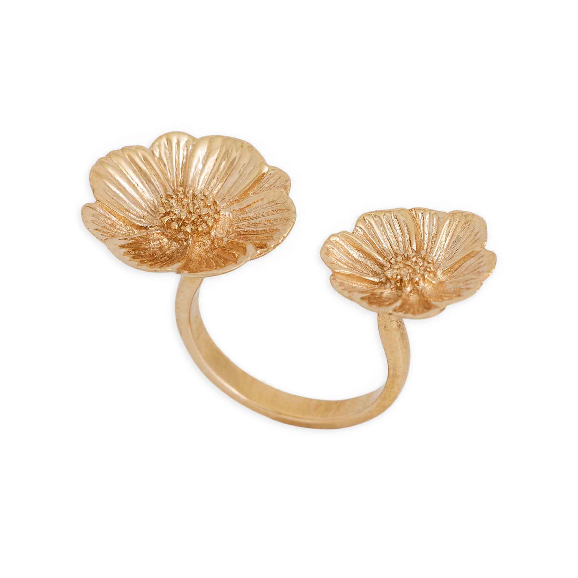 Bronze adjustable peony ring featuring two sculpted peony blossoms with rich petal texture and a softly domed center. Peonies symbolize love, honor, and prosperity, making this floral ring a meaningful statement for botanical jewelry stories and romantic gift themes.