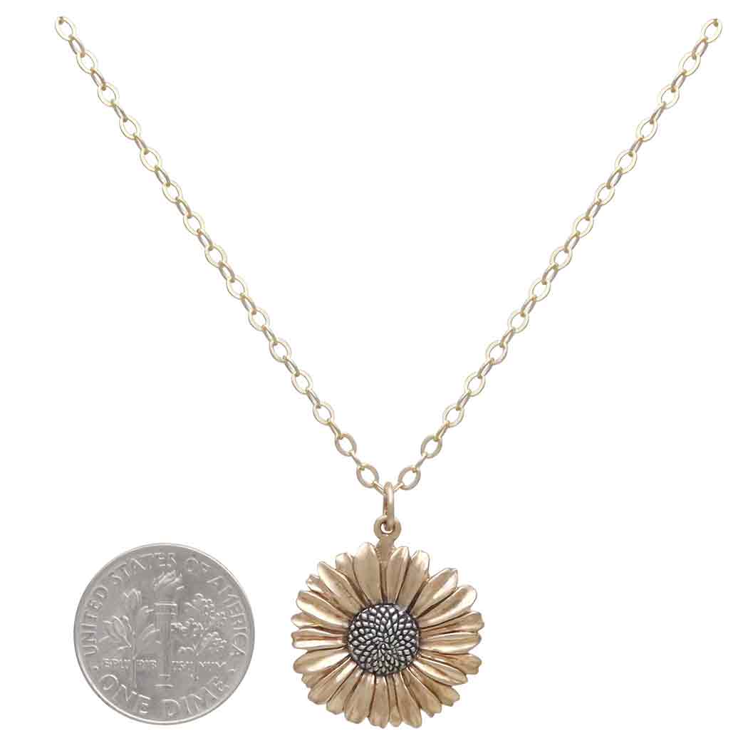 Brighten up even the gloomiest of days with this bronze daisy pendant with sterling silver center on gold fill 18 inch chain. Each petal varies in length and is slightly dipped towards the center, adding eye-catching detail. Daisies are uplifting blossoms evoking positivity and radiance, making them the right pick for jewelry celebrating summer birthdays, Easter, weddings, and so much more.
