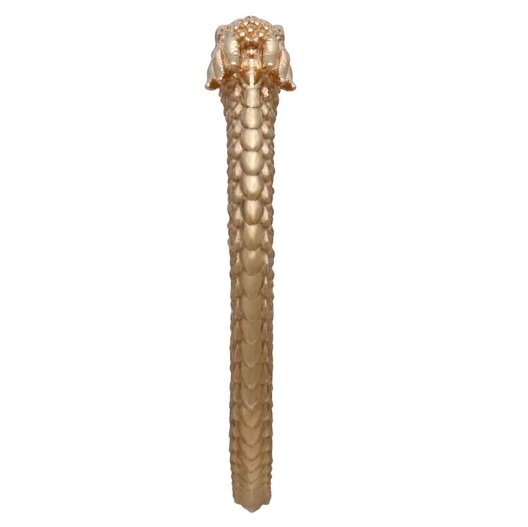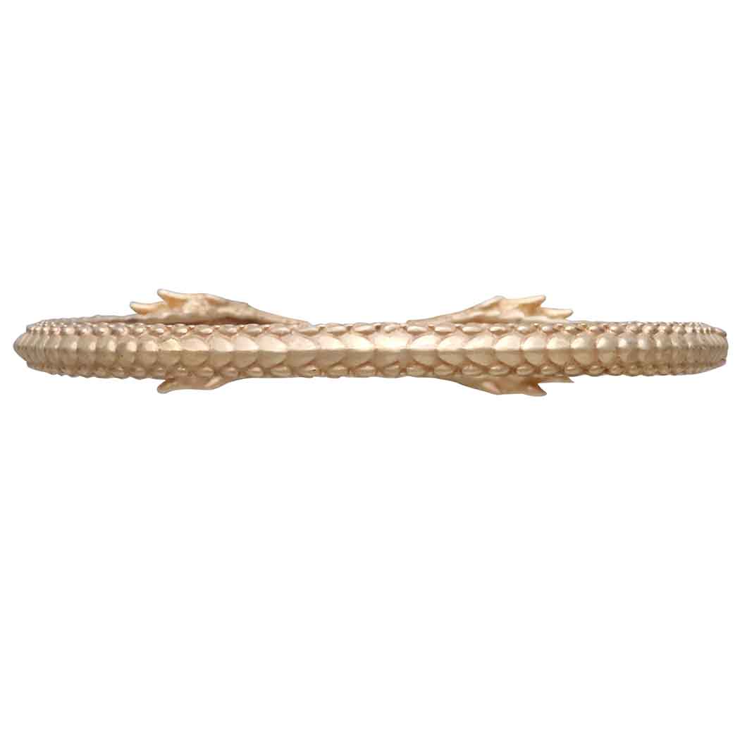 Channel the spirit of dragons—the guardians of secrets and magic with this bronze dragon cuff bracelet. The bracelet is open-ended, with each end adorned by an beautifully detailed dragon's head. The dragons' heads are finely sculpted, capturing their fierce expressions and the textured detail of their scales and horns. The body of the bracelet is crafted to mimic the sinuous form of a dragon's body, with overlapping scales running along its length, giving the bracelet a lifelike texture that adds depth and dimension.