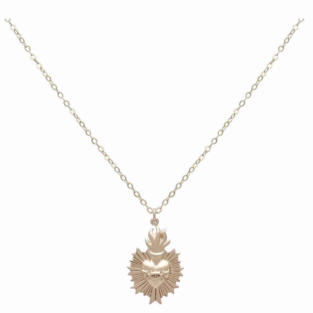 Bronze Flaming Sacred Heart Necklace with Gold Fill Chain. Within the Catholic faith, the sacred heart is a medieval symbol of Christ's sacrifice. It signifies the redeeming love of God as the source of illumination and happiness. This radiant design is romantic and fierce with beautiful detailing on the thorns and rays of light. Wear it close to your own heart as a comforting reminder of faith. Find more Hearts and Religious Charms.
