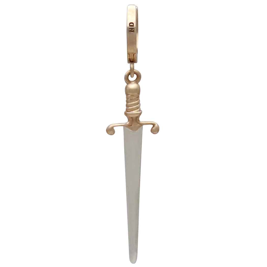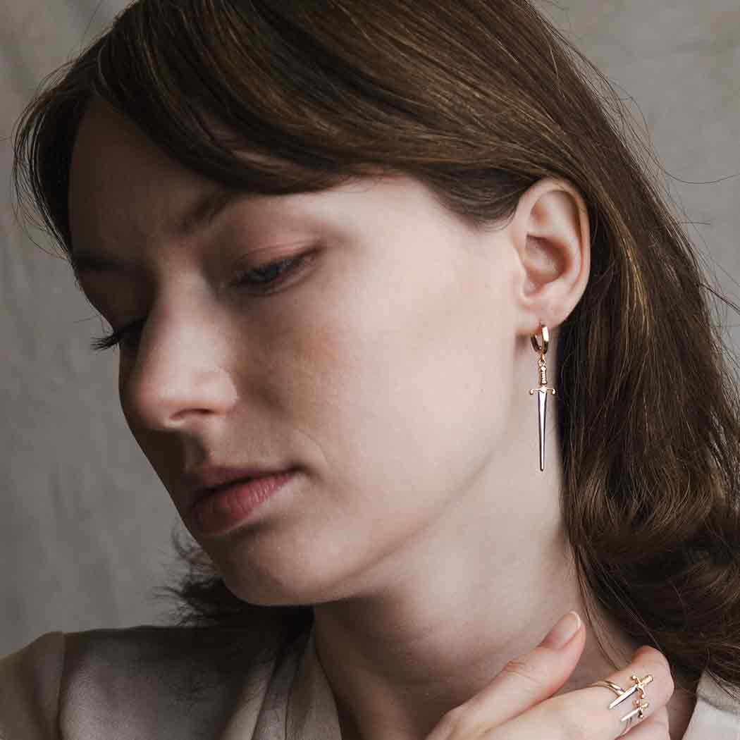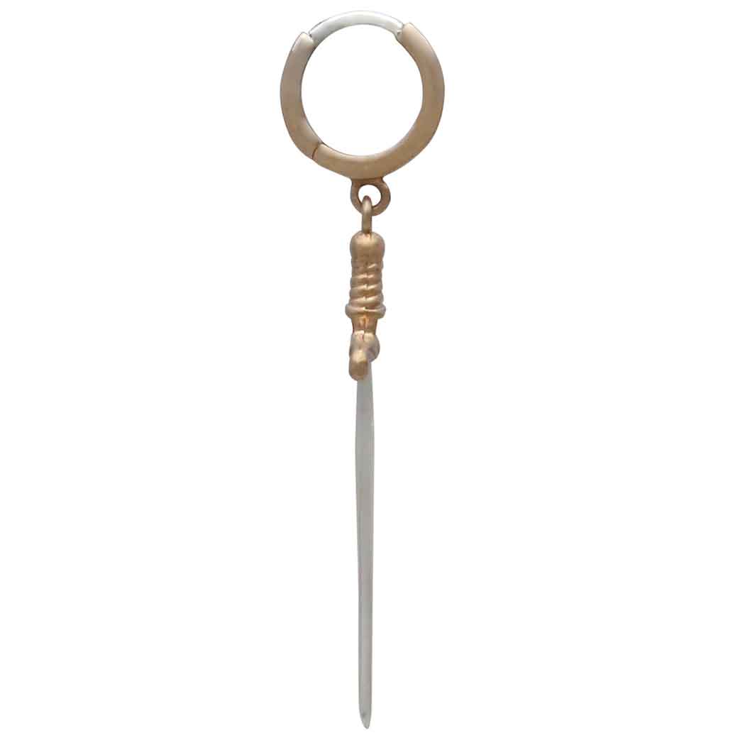 All parts of these bronze huggie hoops with mixed metal swords are wonderfully detailed. From the point to the pommel, these swords look like a miniature of actual Medieval swords. The pronounced quillion and the twisted grip are especially fierce!