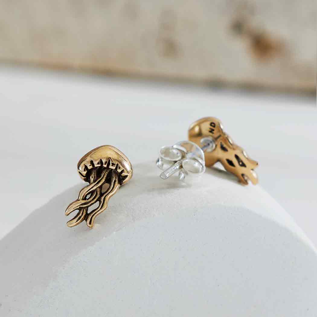 Add a laid back vibe to your jewelry line with these bronze jellyfish earrings with sterling silver posts. Its parachute top and spiraling tentacles highlight their langourous movement, and highlight the wondruous diversity of life on our planet.