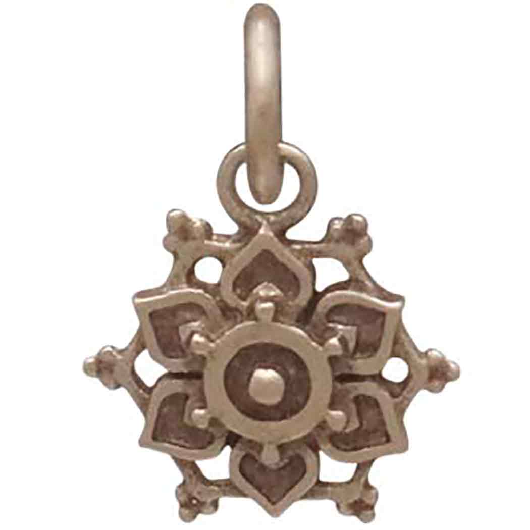 This sterling silver lotus mandala charm with granulation is perfectly petite. Many consider mandalas instruments of wholeness, healing, and meditation.