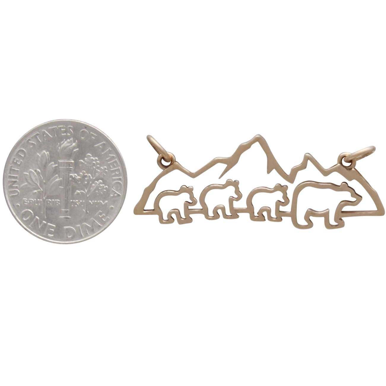 Thrill the fiercest of mamas out there with this bronze mama & three baby bears festoon pendant. The mountain skyline frames mama and baby bears as if to say "go forth, live among my bounty and thrive." You can almost feel mama bear's courage and guidance as she ventures out of their mountain den for the first time after a long winter.