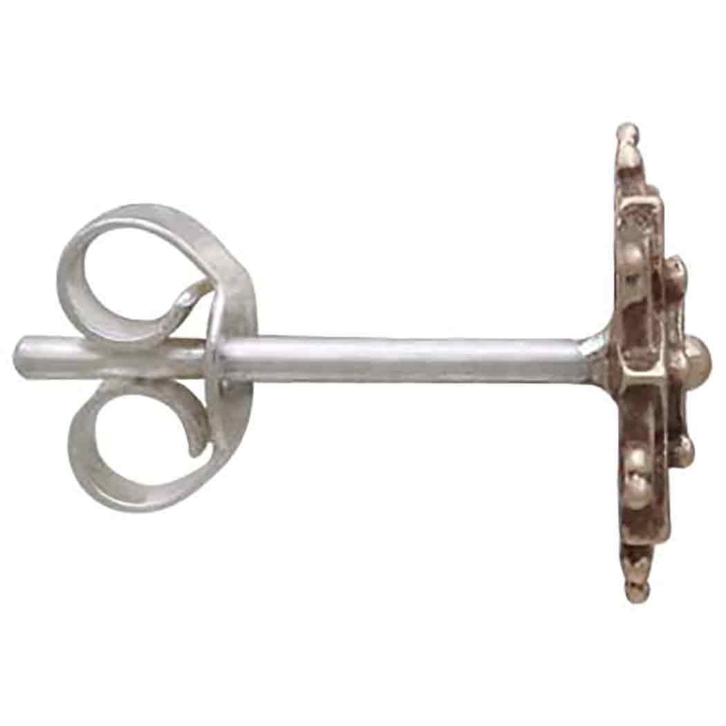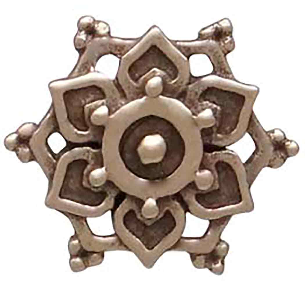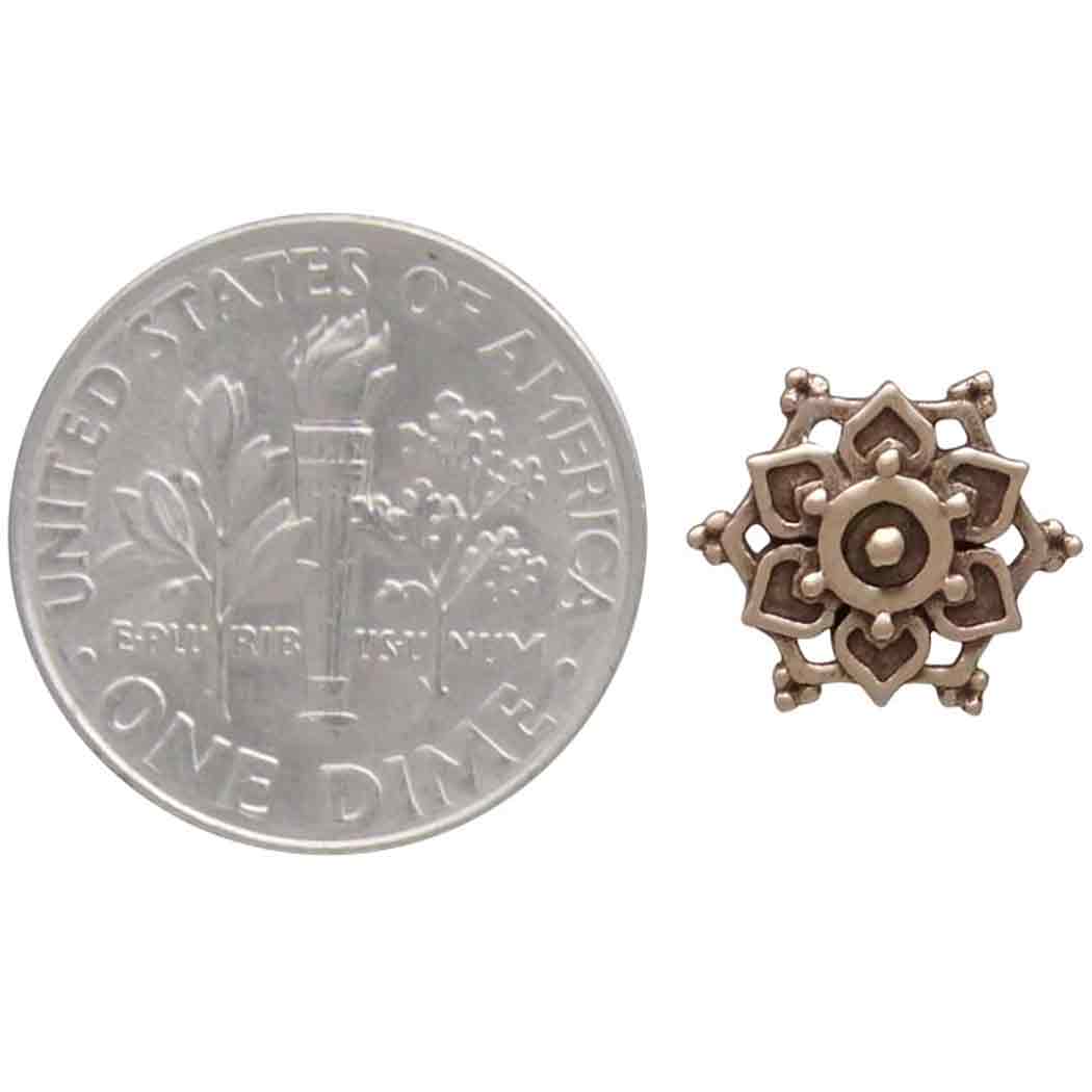 These bronze lotus mandala stud earrings with granulation are rich in details and perfectly petite. These earrings feature a bronze mandala and a sterling silver post and backing. Many consider mandalas instruments of wholeness, healing, and meditation. In this many petaled flower earring, the lotus becomes a mandala - a visually appealing, overlapping, geometric form that helps quiet chattering thoughts, appeasing the spirit.