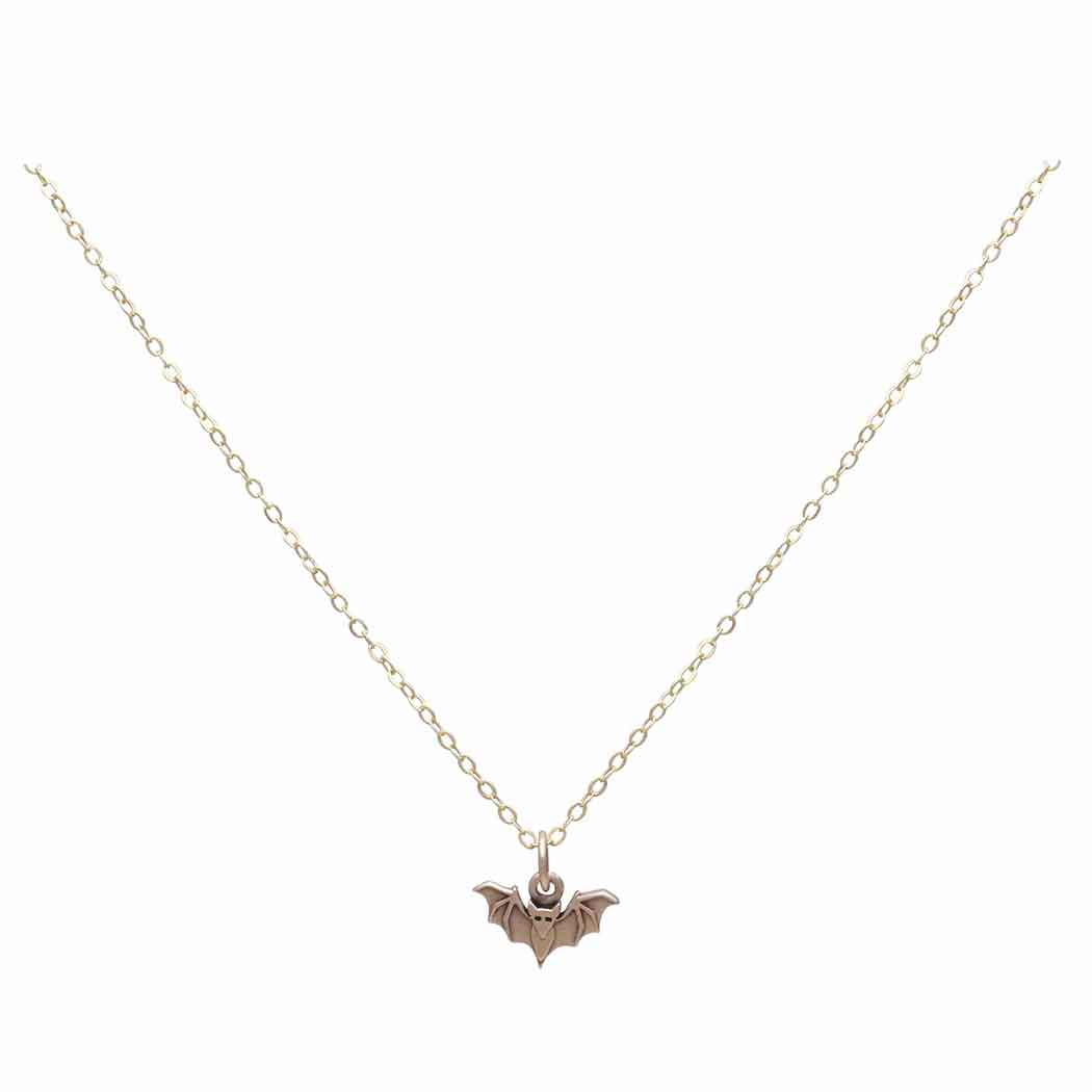 Comes on a simple gold fill 18" cable chain with spring ring clasp. Bronze Mini Bat charm measures 8x12mm, excluding jumpring. See our measurement guide.