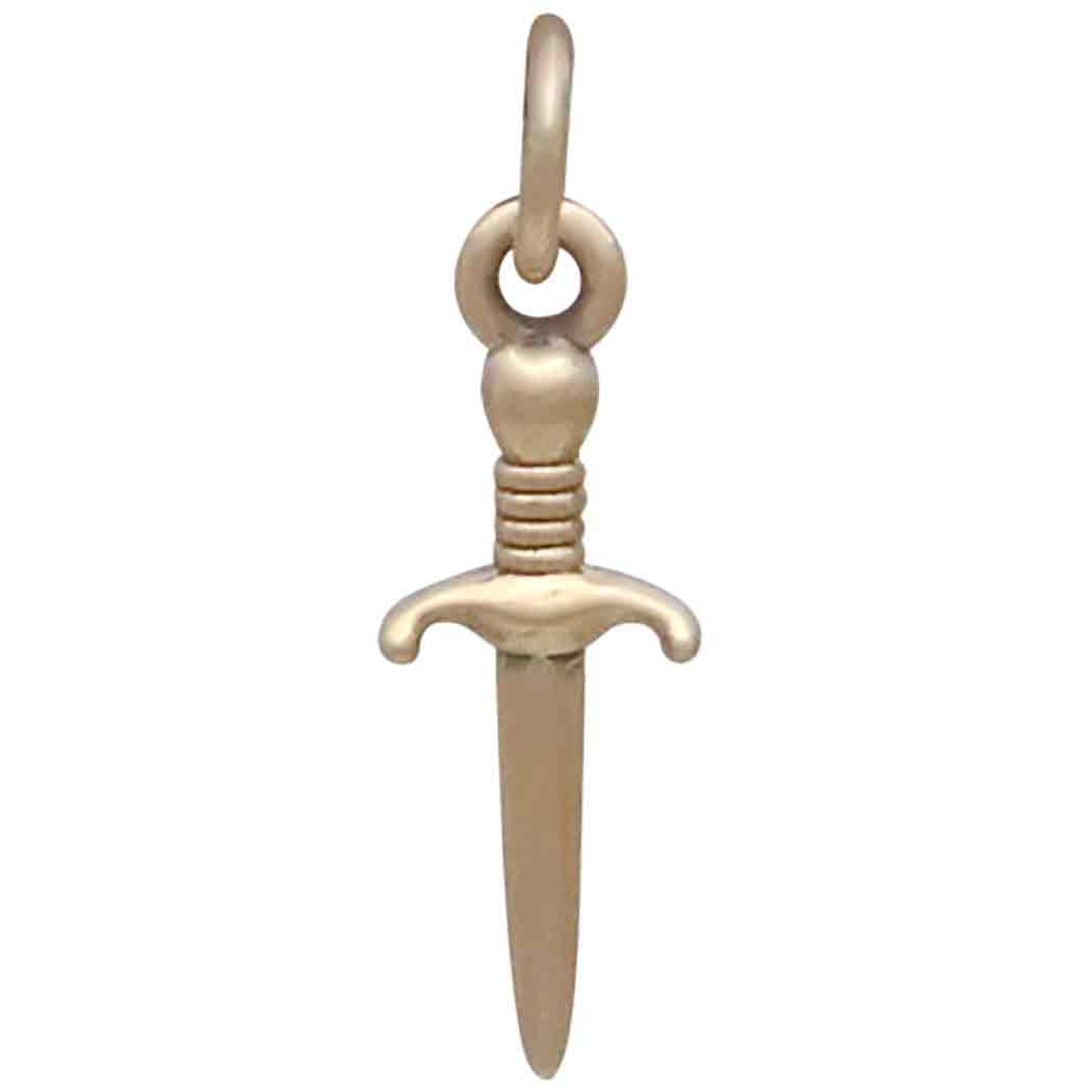 All parts of this bronze mini dagger charm are wonderfully detailed. From the point to the pommel, this dagger charm looks like the real thing. The pronounced quillion and the twisted grip are especially fierce! Perhaps the earliest of concealed weapons and often a warrior's last defense, daggers represent betrayal, loss, protection, valor, and sacrifice.