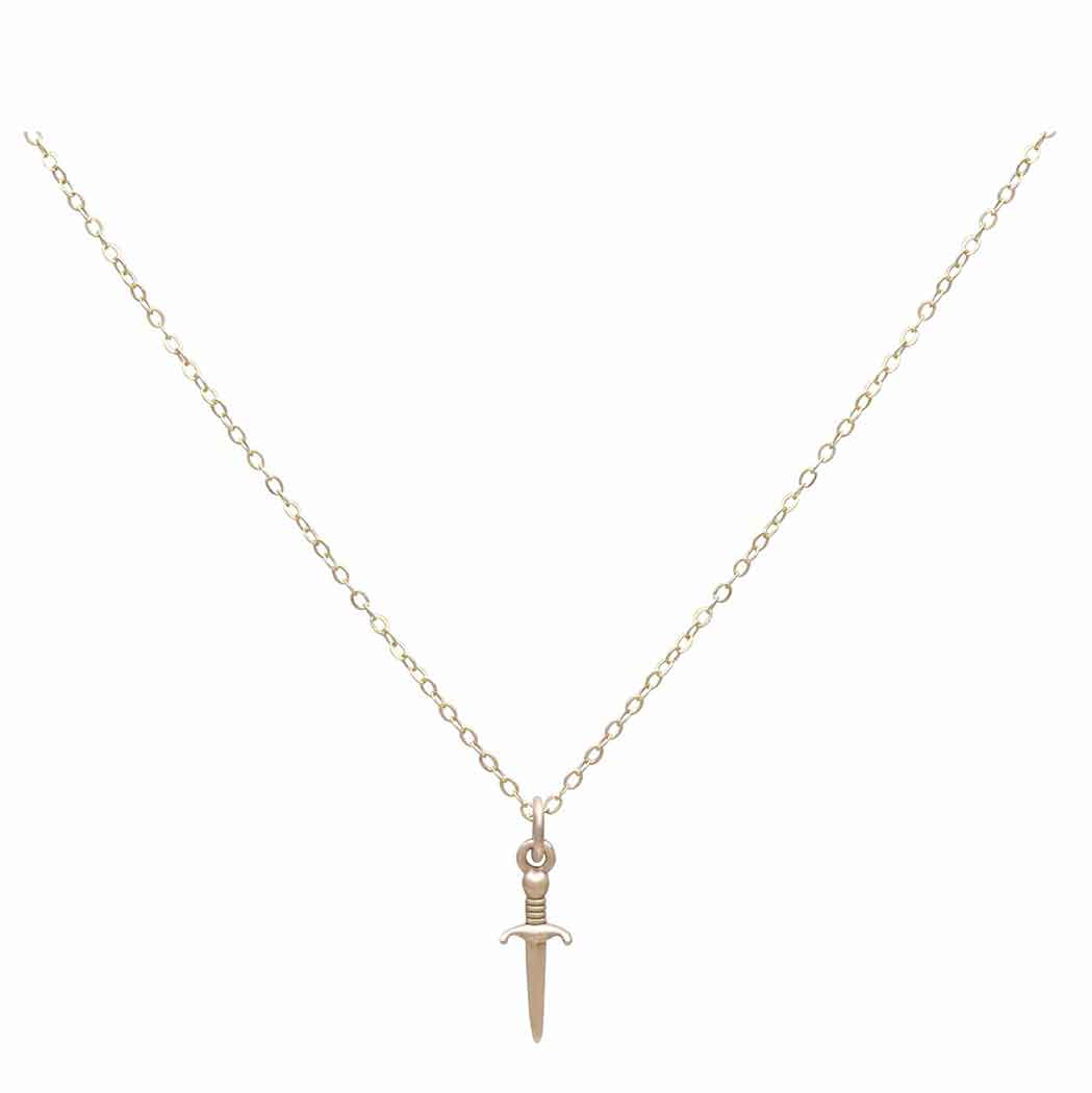 All parts of this Bronze Mini Sword Necklace with Gold Fill Chain are wonderfully detailed. From the point to the pommel, this dagger charm looks like the real thing. The pronounced quillion and the twisted grip are especially fierce! Perhaps the earliest of concealed weapons and often a warrior's last defense, daggers represent betrayal, loss, protection, valor, and sacrifice.