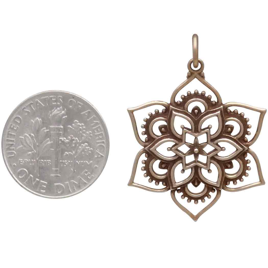 Consider this bronze openwork lotus mandala a symbol of wholeness, meditation, and healing. In this many petaled flower charm, the lotus becomes a mandala - a visually appealing, overlapping, geometric form that helps quiet chattering thoughts, appeasing the spirit. From its center to its rim, this mandala's symmetry and beauty is exquisite.