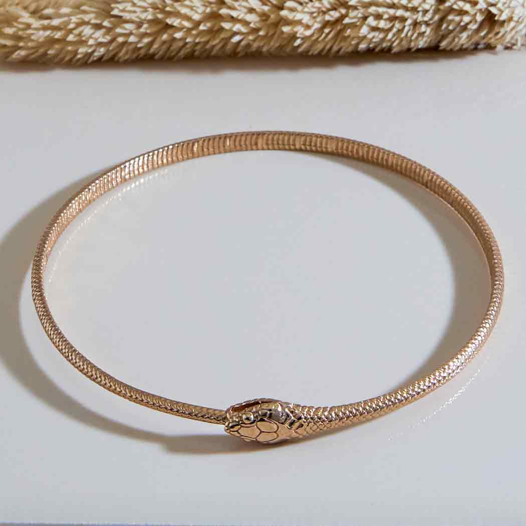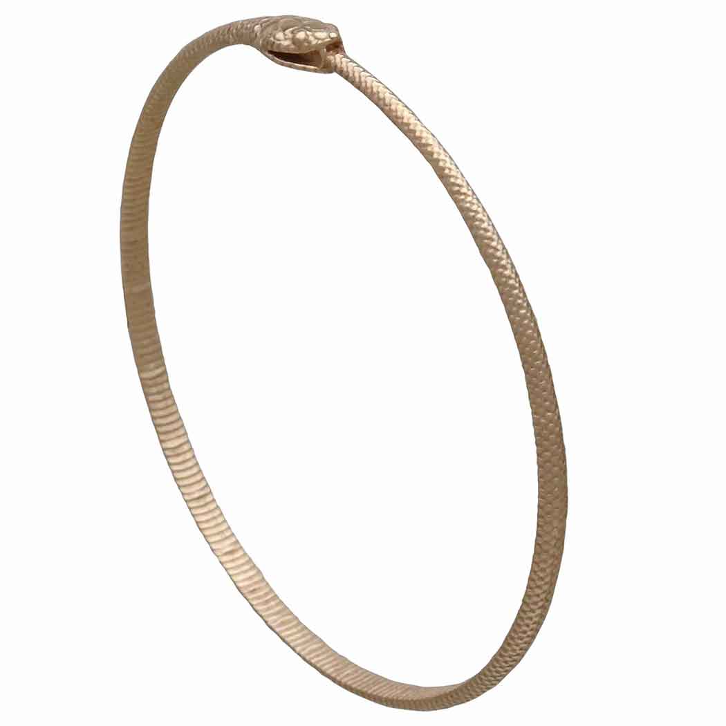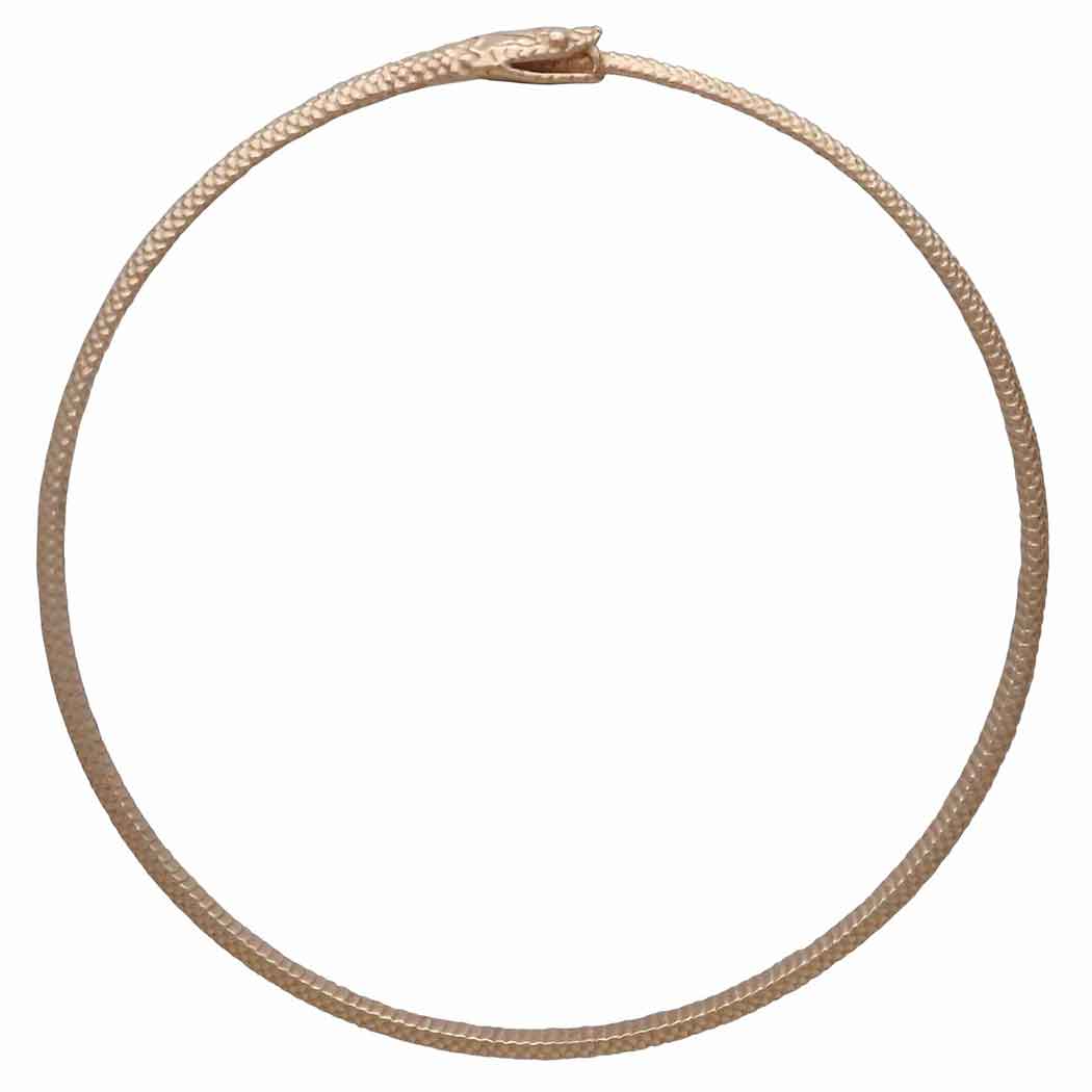 The entire surface of this bronze ouroboros bangle bracelet features lovely texturing resembling snake skin. At one point along the bracelet you will find the head of the snake complete with fangs eating it's own tail.