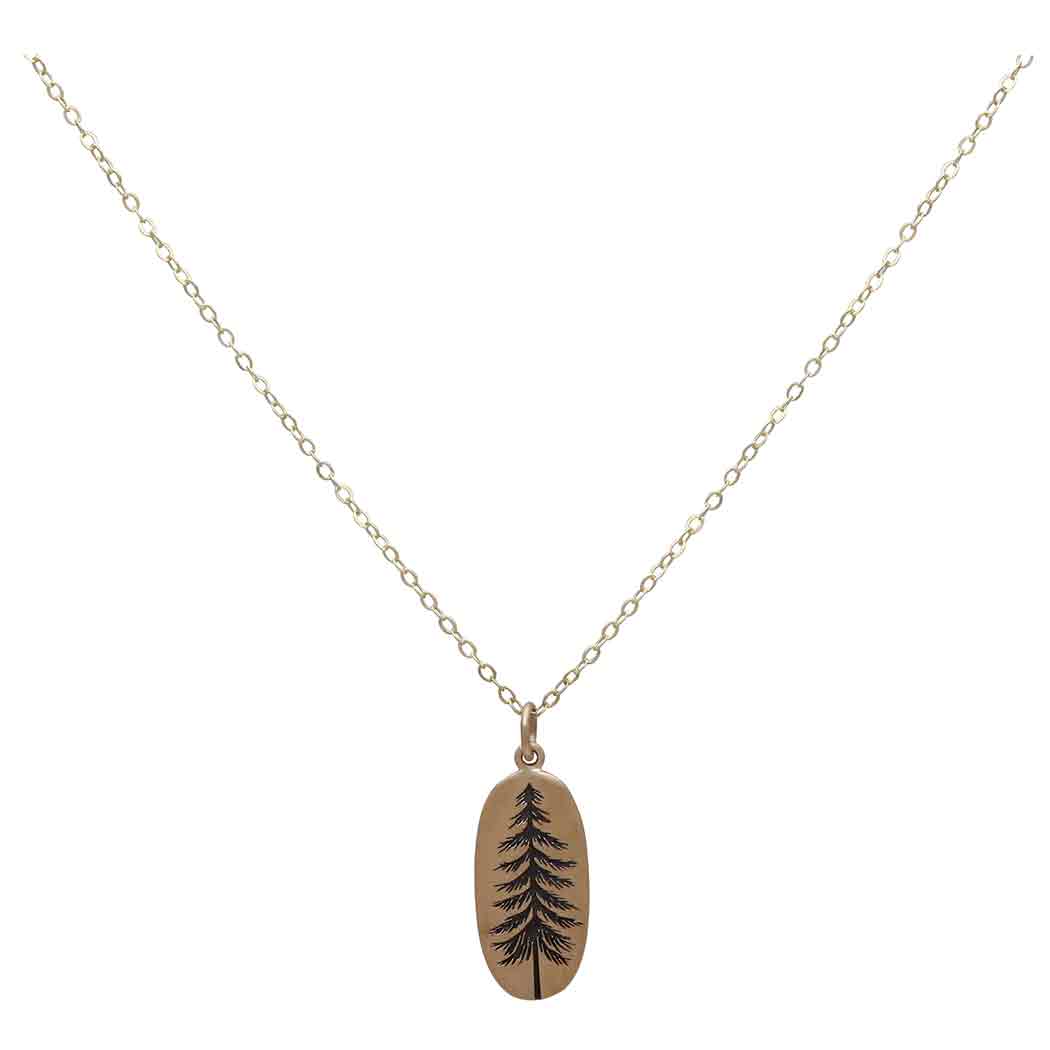 Comes on a simple gold fill 18" cable chain with spring ring clasp. The bronze pine tree charm measures 22x10mm, excluding jumprings.