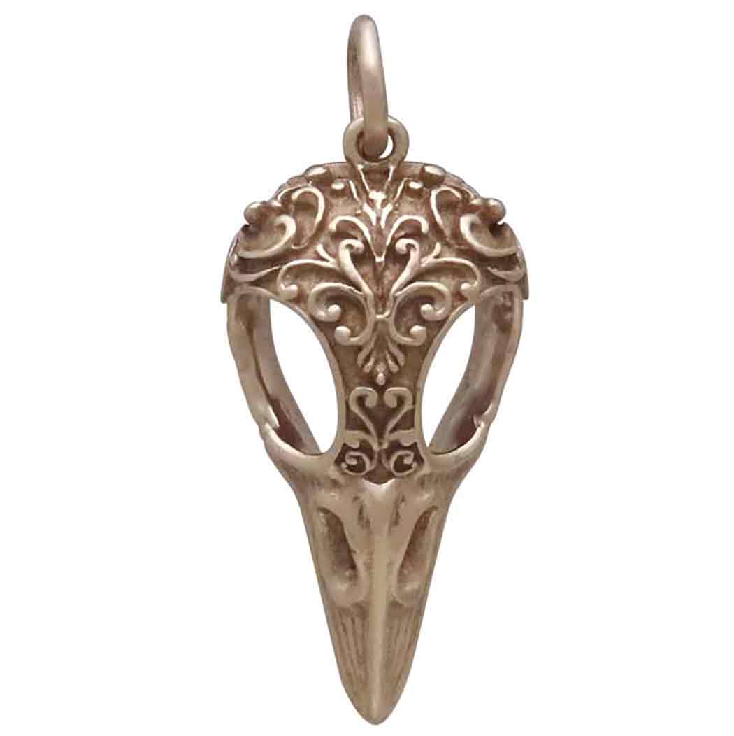 The beauty of this bronze raven skull charm with scroll carving will cast a spell on you. All the details from the lined ridges of the beak to the fanciful scroll work crowning the skull distinguishes this raven skull charm from others.