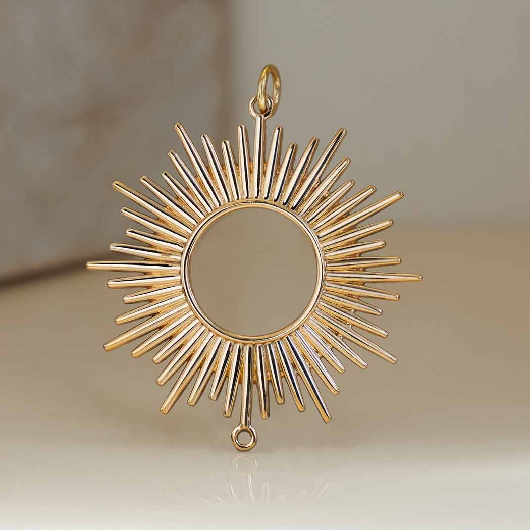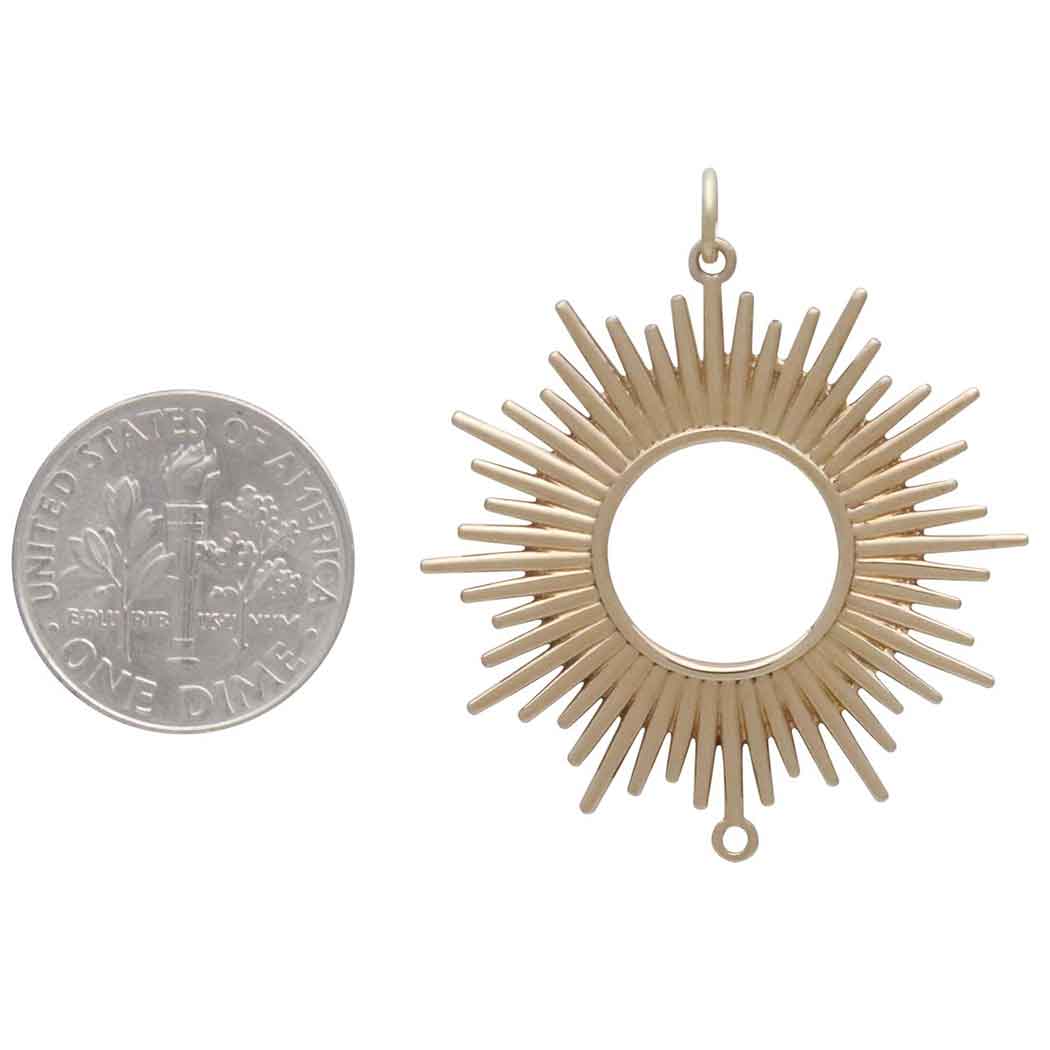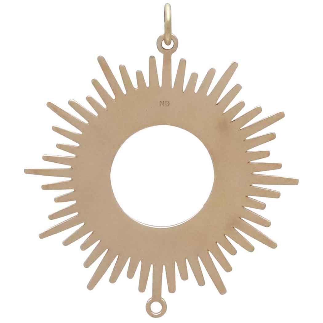Celebrate the radiance of the sun with this bronze spikey sun pendant link. This full circle of sun rays emanates power and sheer joy. This is a fierce piece, with dramatic pointy spikes that require a bit of mindfulness when wearing it.