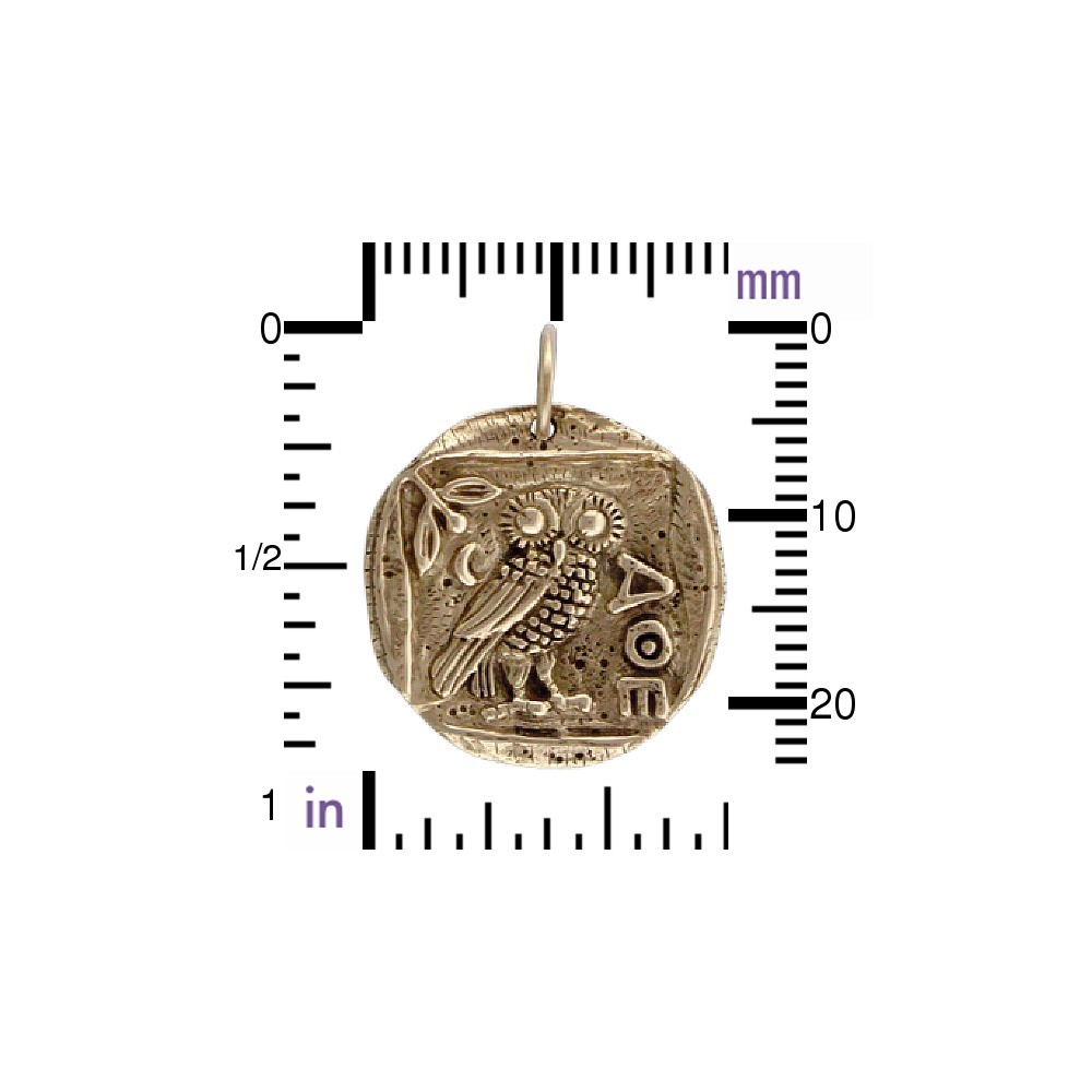 Bronze Ancient Coin with Athena's Owl Charm. A lovely replica of an ancient Greek coin. In Greek mythology, Athena is the goddess of war, wisdom, strength, crafts, justice and skill. In Homeric poetry, Athena's most common epithet translates to "bright-eyed" or "with gleaming eyes," much like an owl. Many scholars argue that Athena is the owl herself - she is wisdom. Shop the entire collection of Ancient Coins.