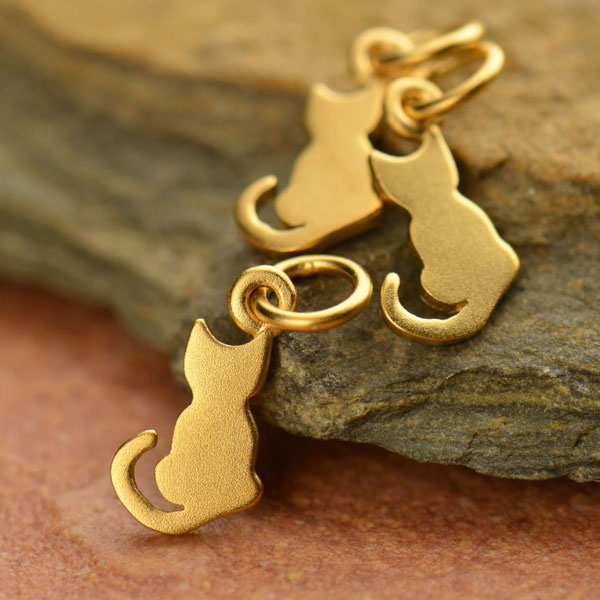 Tiny Satin 24K Gold Plated Sterling Silver Sitting Cat Charm. This little cat is sitting in a windowsill watching the world outside go by. A sweet kitty sitting patiently with a tiny curled tail is just the thing for animal lovers. Take this little cat home with you and it will be sure to bring a smile to your face and warmth to your heart. Pair with more adorable animal charms or browse our Pet Lovers theme!