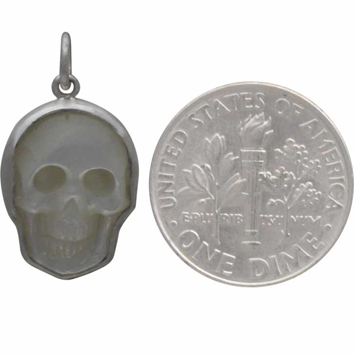This mother of pearl skull charm is hand carved and measures 21mm in length. This luminescent and shimmering skull pendant is perfect for Talisman Jewelry Designs! This Halloween Pendant with a sterling silver frame, cap and jump ring makes for a great focal piece. Besides being morbidly elegant, skull charms are also appealing because they can symbolize rebirth, renewal, and spiritual awakening. With a chunkiness and thickness, that does not translate into its weight, this piece can be worn alone on a leather strap or incorporated into beautiful designs.