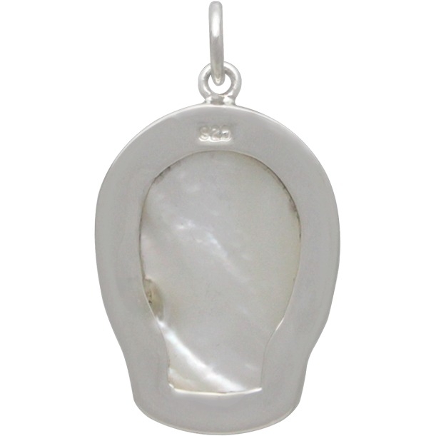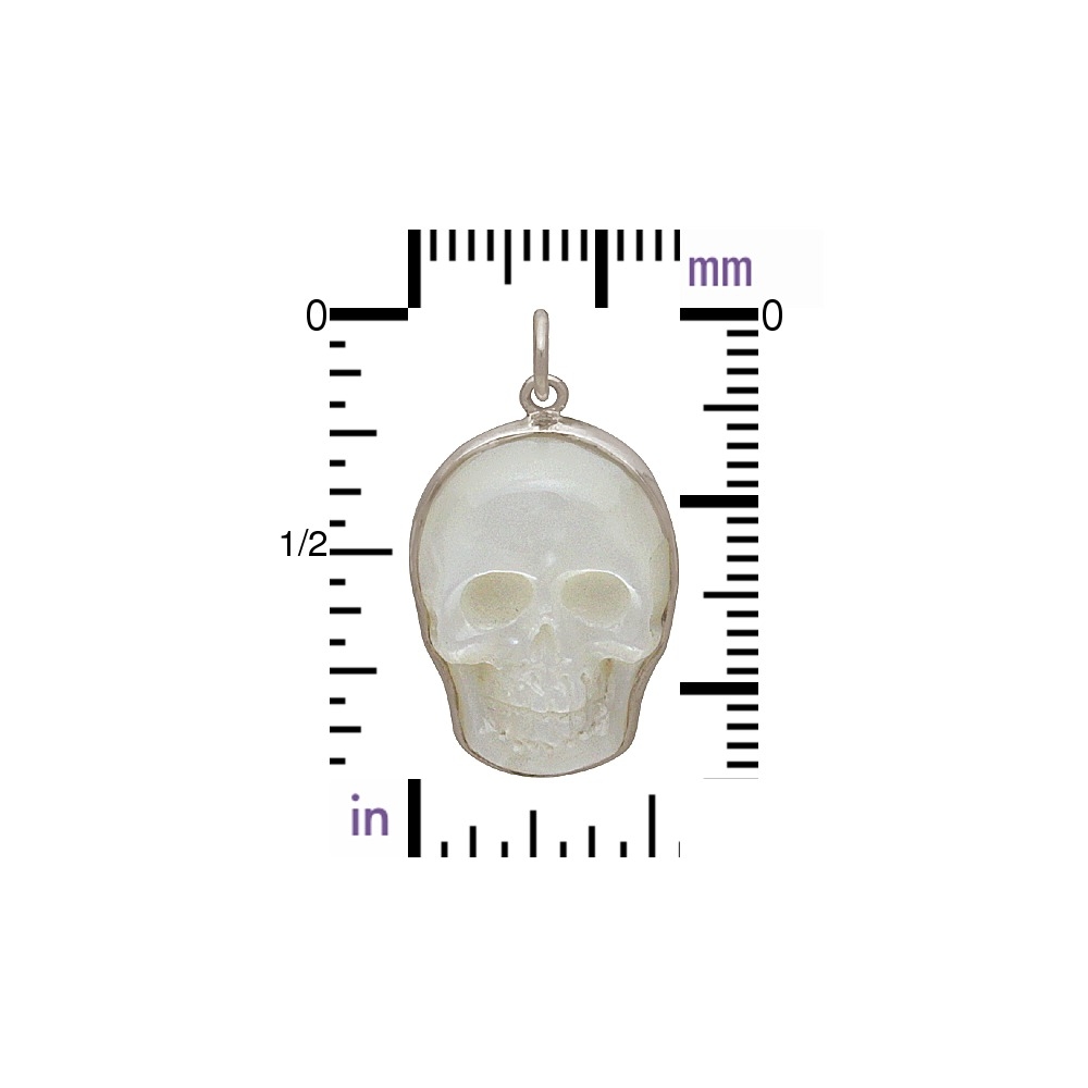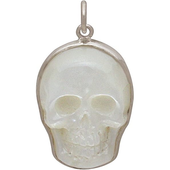 Hand Carved Mother of Pearl Skull Pendant. This luminescent and shimmering Skull Charm is perfect for Talisman Jewelry Designs! This Halloween Pendant with a Sterling Silver Frame, Cap and jump ring makes for a great focal piece. Besides being morbidly elegant, skull charms are also appealing because they can symbolize rebirth, renewal, and spiritual awakening. With a chunkiness and thickness, that does not translate into its weight, this piece can be worn alone on a leather strap or incorporated into beautiful designs. Find more of our Talismans!