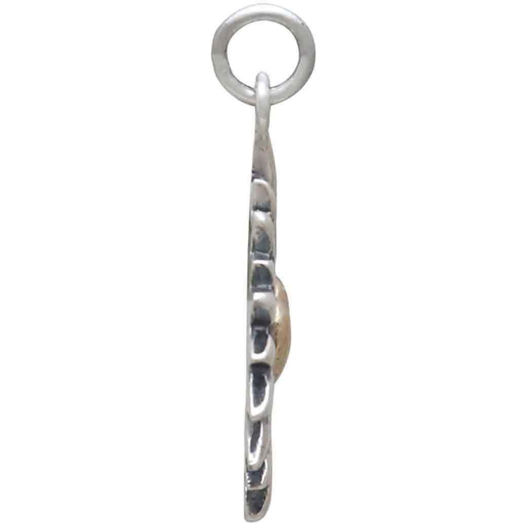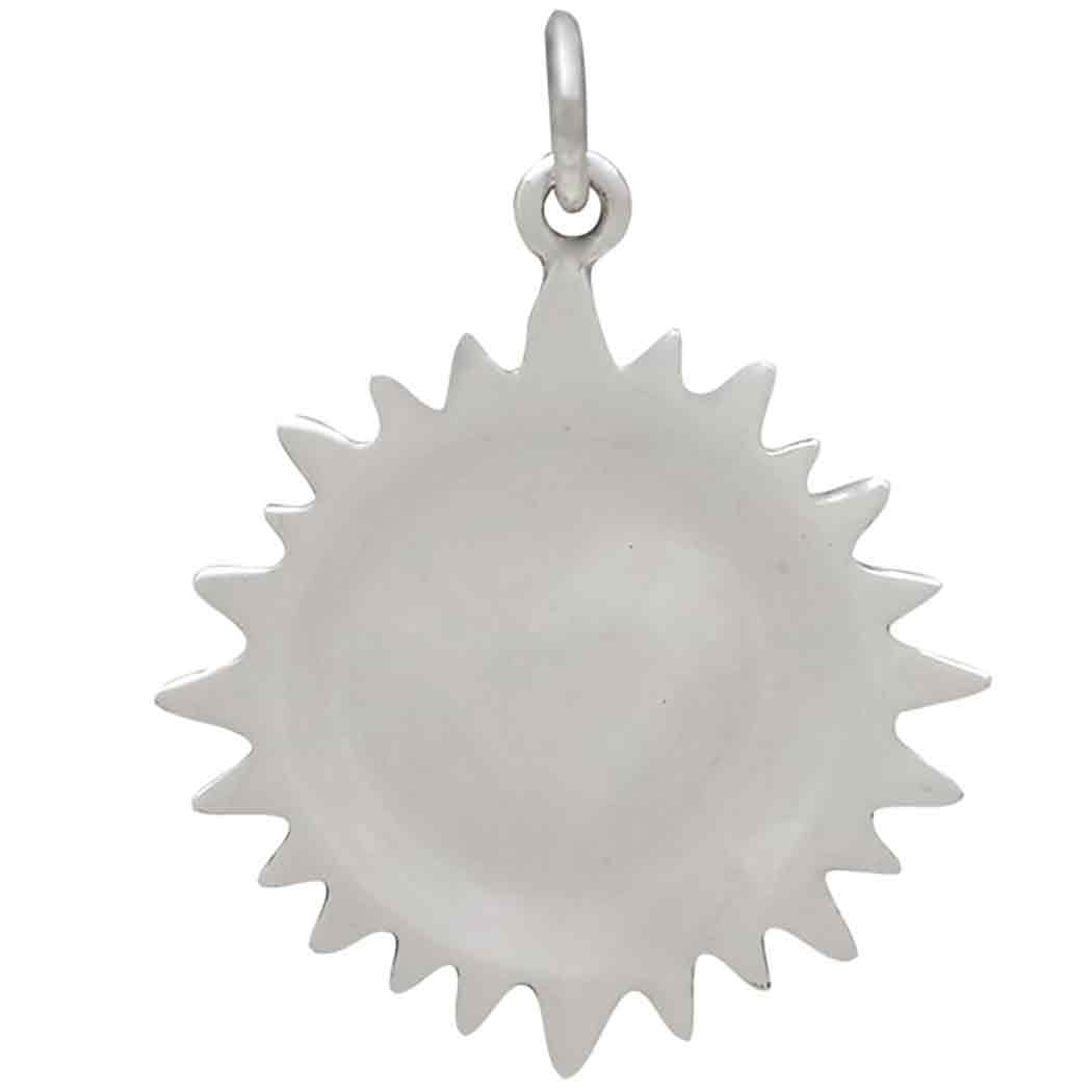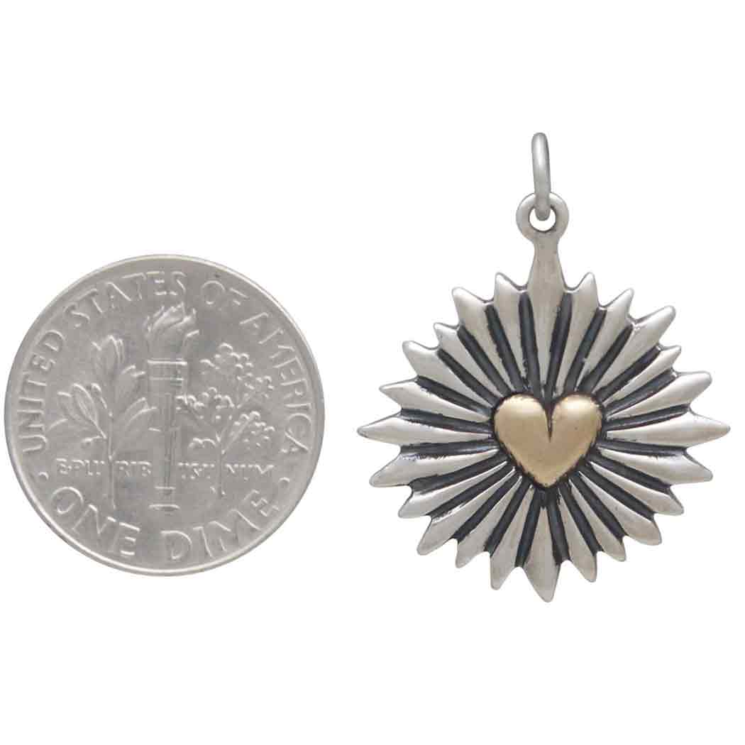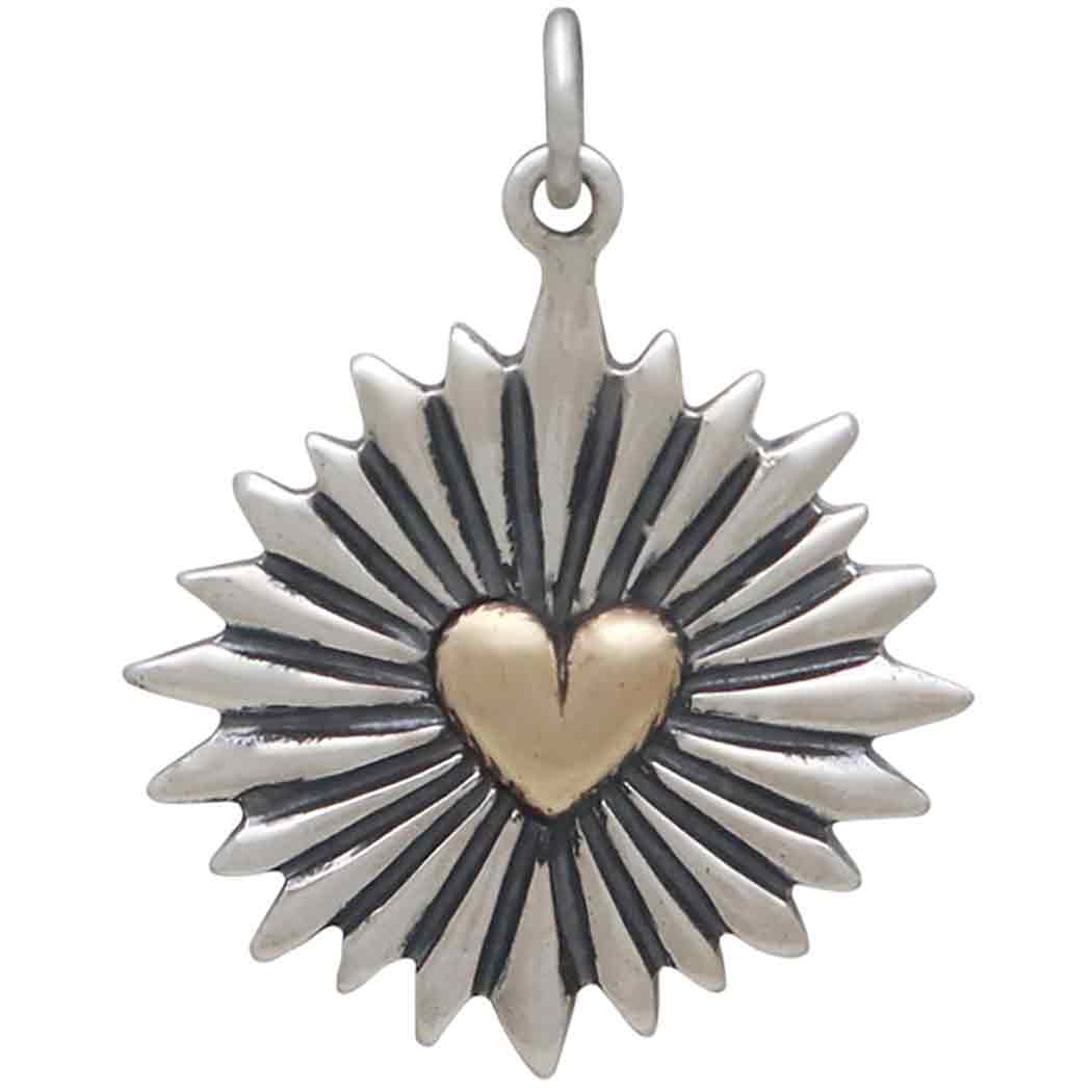 Beautifully baroque and completely romantic, this large mixed metal heart pendant with sunrays features a brilliant bronze heart. The contrast between the warm bronze and the sterling silver ridged rays is stunning. It's details like this that draw your customers' attention and get heads turning.