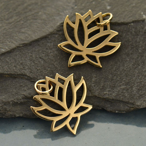 Small Natural Bronze Lotus Flower Charm. Considered by many as the most beautiful flower in the world, the lotus blossom has come to symbolize enlightenment, serenity, and determination to grow strong under any circumstance. One of our all time best sellers, this charm is lovely on earrings, necklaces and bracelets. Try stringing to various points among the open work petals for a fresh perspective. Browse more Lotus Charms.