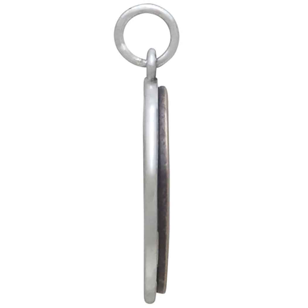 Two powerful symbols of intuition, wisdom, and sensitivity come together with this mixed metal bat and bronze crescent moon charm. Due to their keen senses, bats symbolize perception, dreams, and visions. The moon's gentle light, its role in natural cycles, and its profound impact on the night sky and human consciousness combine to make it a potent emblem for awareness. The contrast between the luminous bronze moon & shiny sterling silver bat against the oxidized dark night skies is stunning, creating a mood your customers will find tempting.