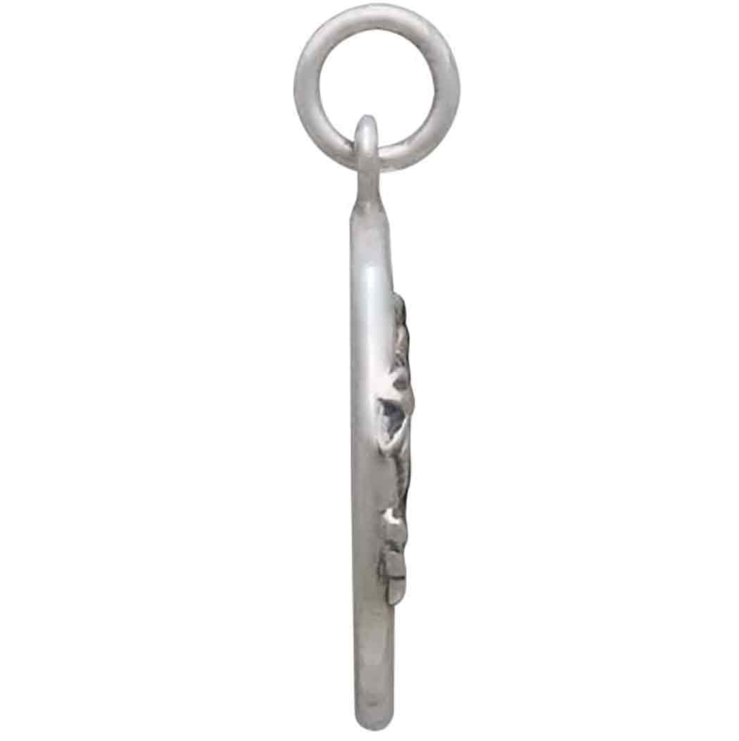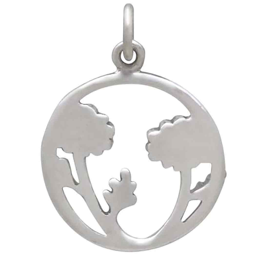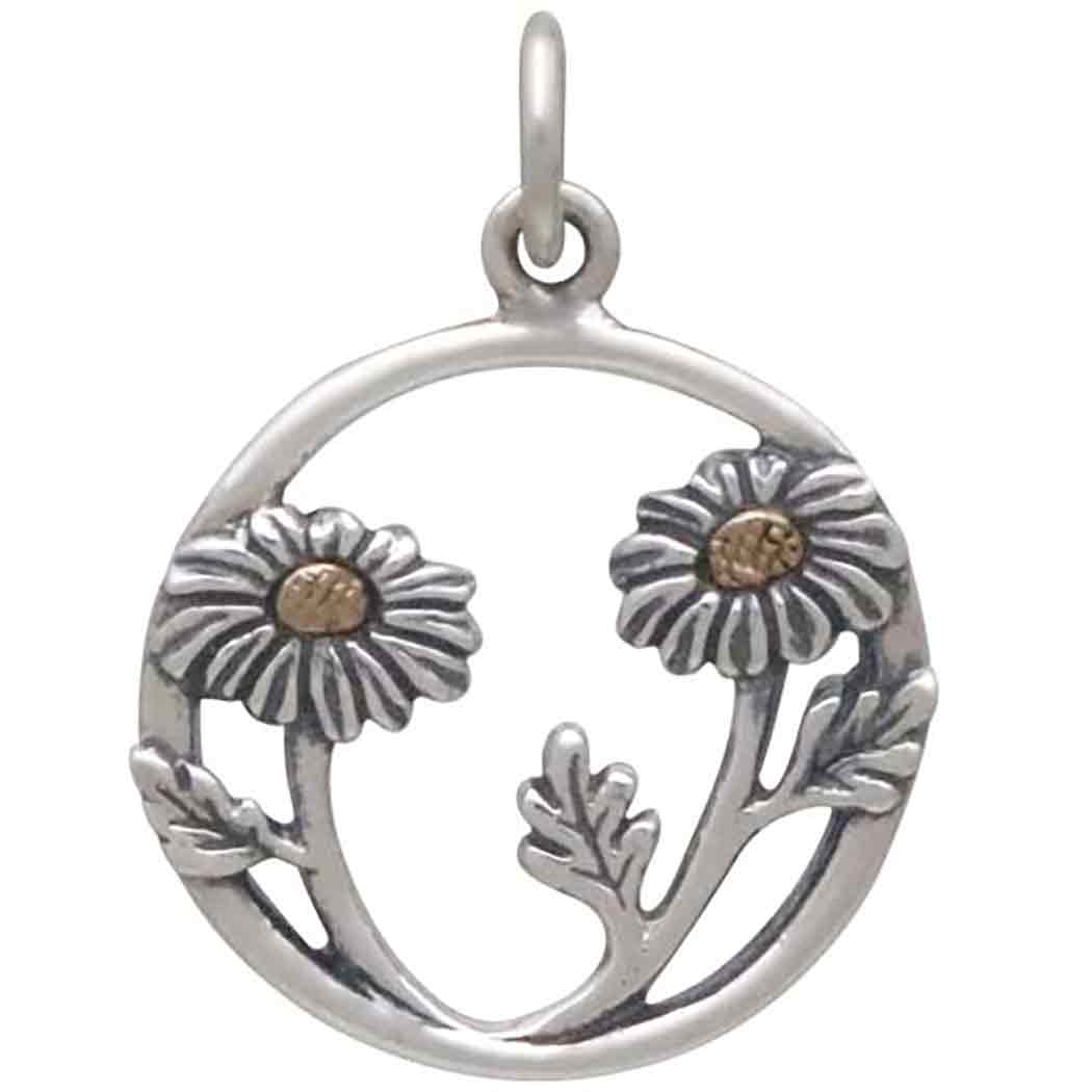 This mixed metal daisies in a circle pendant is upbeat and perky, and offers many opportunities for embellishment. This daisy pendant is sterling silver with bronze accents in the center of the daisies.There's a total of three spaces among the daisy stems where you or your customers can showcase colorful beads. Native American wisdom recognizes the daisy as a sun symbol. It's bright yellow center & radiating white petals resemble the rays of the sun.
