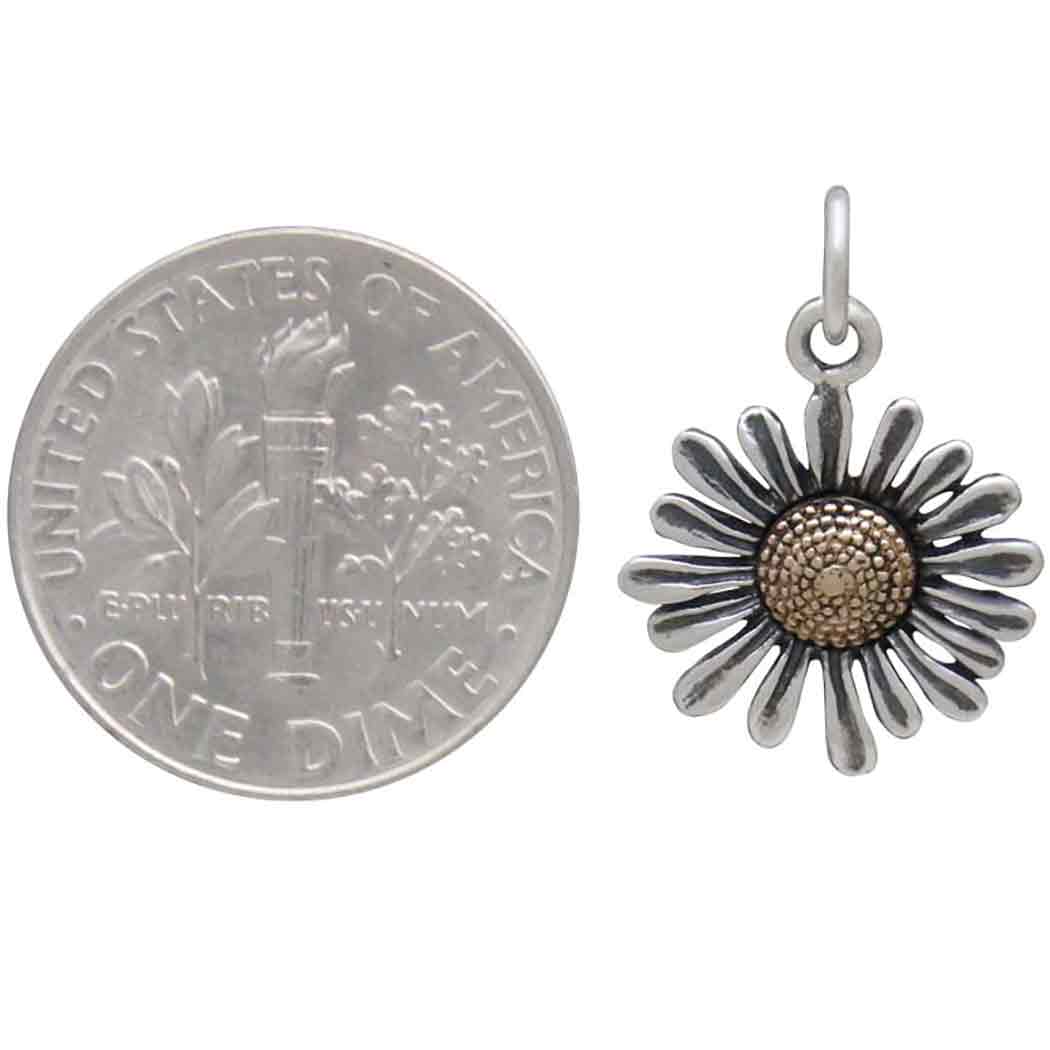 Uplift spirits with this perky mixed metal daisy charm. It's marvelously detailed. Each petal varies in length and is slightly dipped and darkened, adding eye-catching depth; and its center is a warm gold color with dotted texture - just like real daisies! The symbolic meaning of the daisy has a lot to do with purity, positivity, and radiance. Who among us hasn't plucked the petals of a daisy, chanting "(S)he loves me, (s)he loves me not," secretly hoping the last petals reveal, "YES! (S)he loves me!" There is a certain innocence here, like children playing at love, that is associated with daisies.