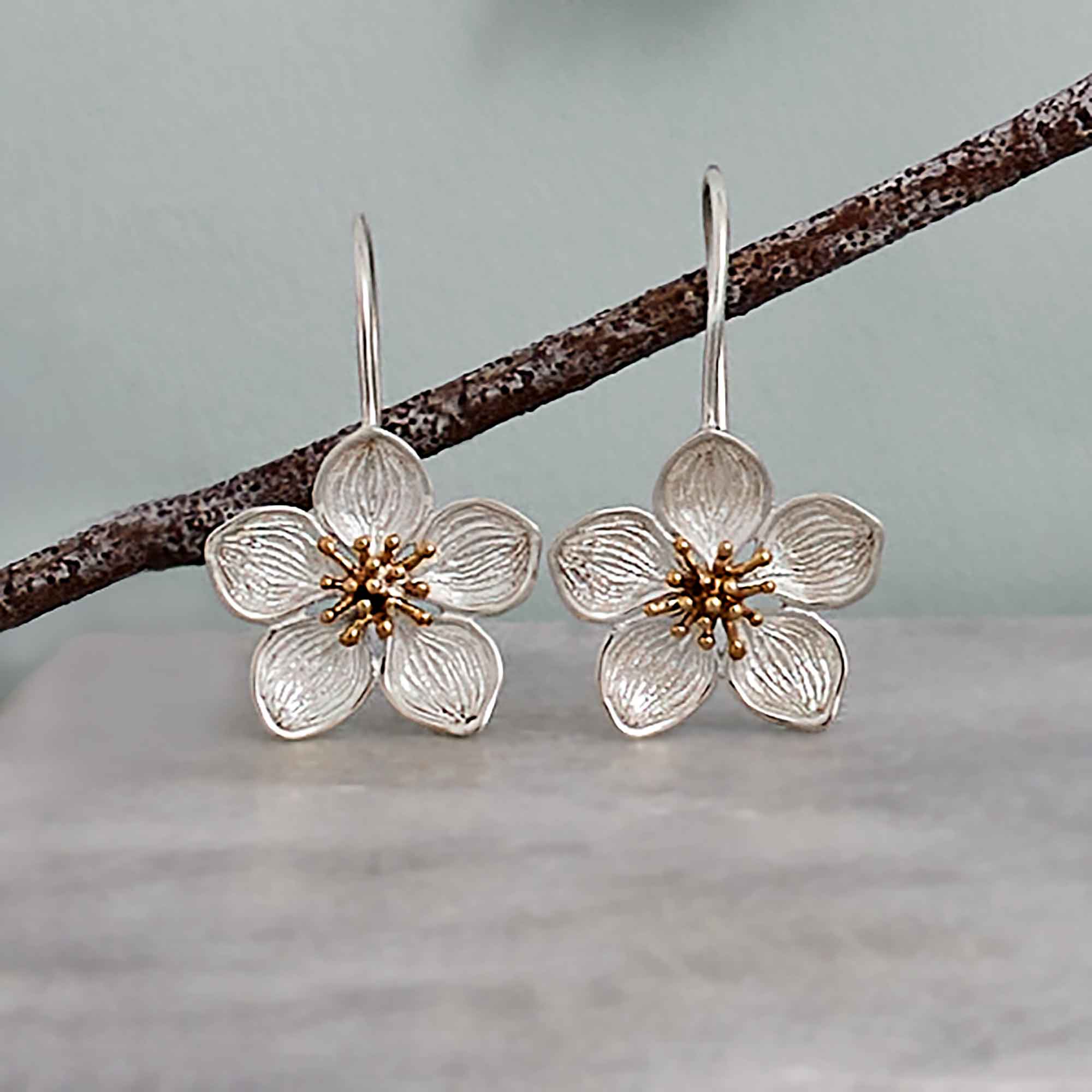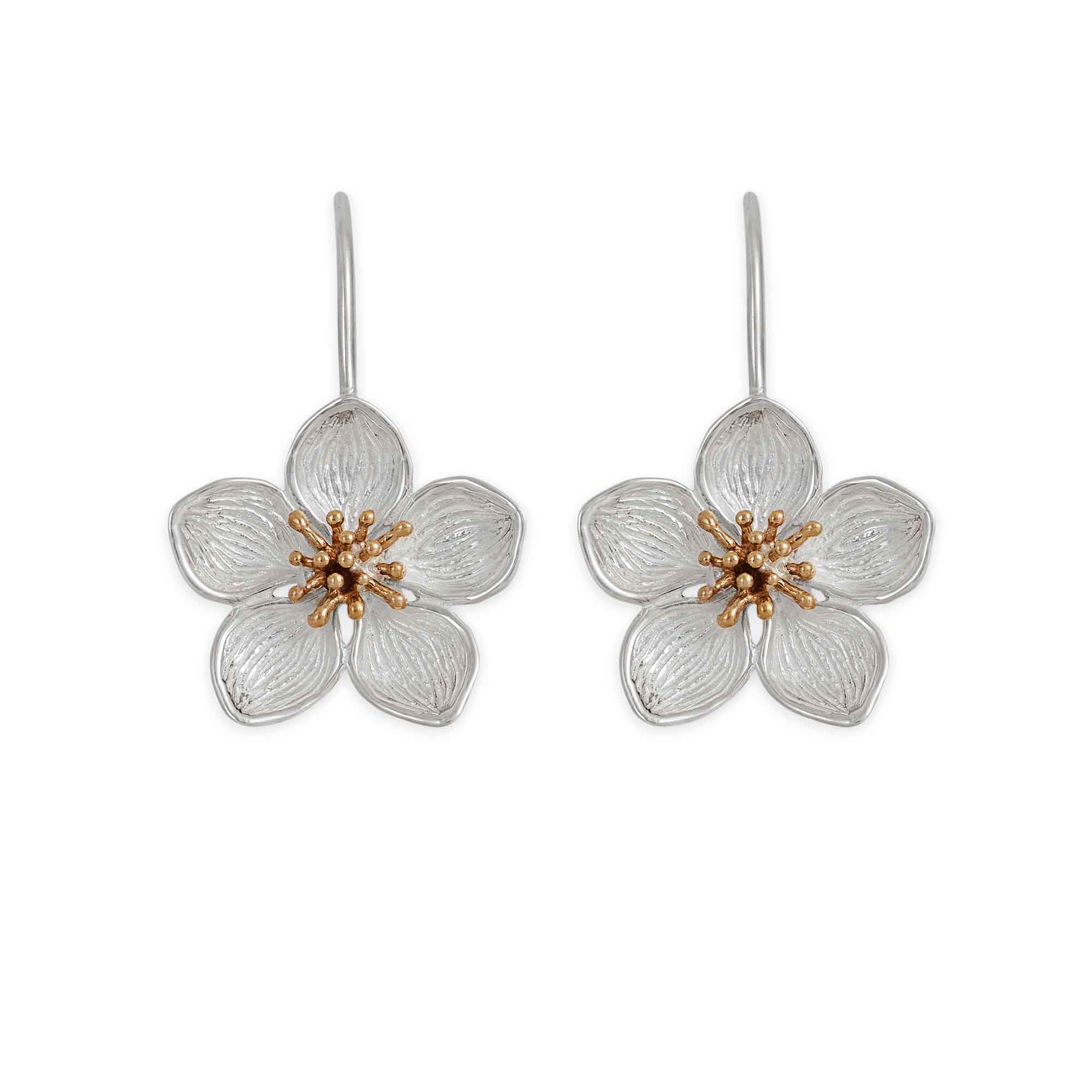 Delicate and expressive, these mixed metal dimensional cherry blossom hook earrings capture the fleeting beauty of spring in full bloom. Each earring features a sculpted cherry blossom with softly layered sterling silver petals and a warm bronze center, creating a striking contrast that highlights the flower’s natural depth and form. The dimensional design brings the blossoms to life, while the hook ear wires allow for gentle movement that catches the light with every turn. Lightweight and comfortable, these earrings offer an effortless elegance suited for everyday wear or seasonal styling.