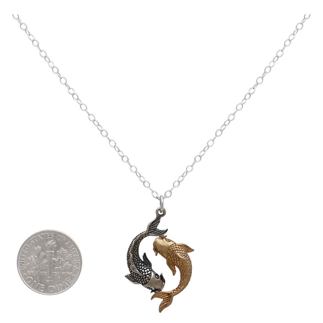 Embrace the harmonious balance of duality with this Sterling Silver and Bronze Koi Necklace. This captivating design features two intricately detailed koi fish swimming in perfect harmony, symbolizing the yin and yang of life's flow. Crafted with a stunning contrast of sterling silver and warm bronze, the pendant beautifully captures the essence of balance, unity, and prosperity.
