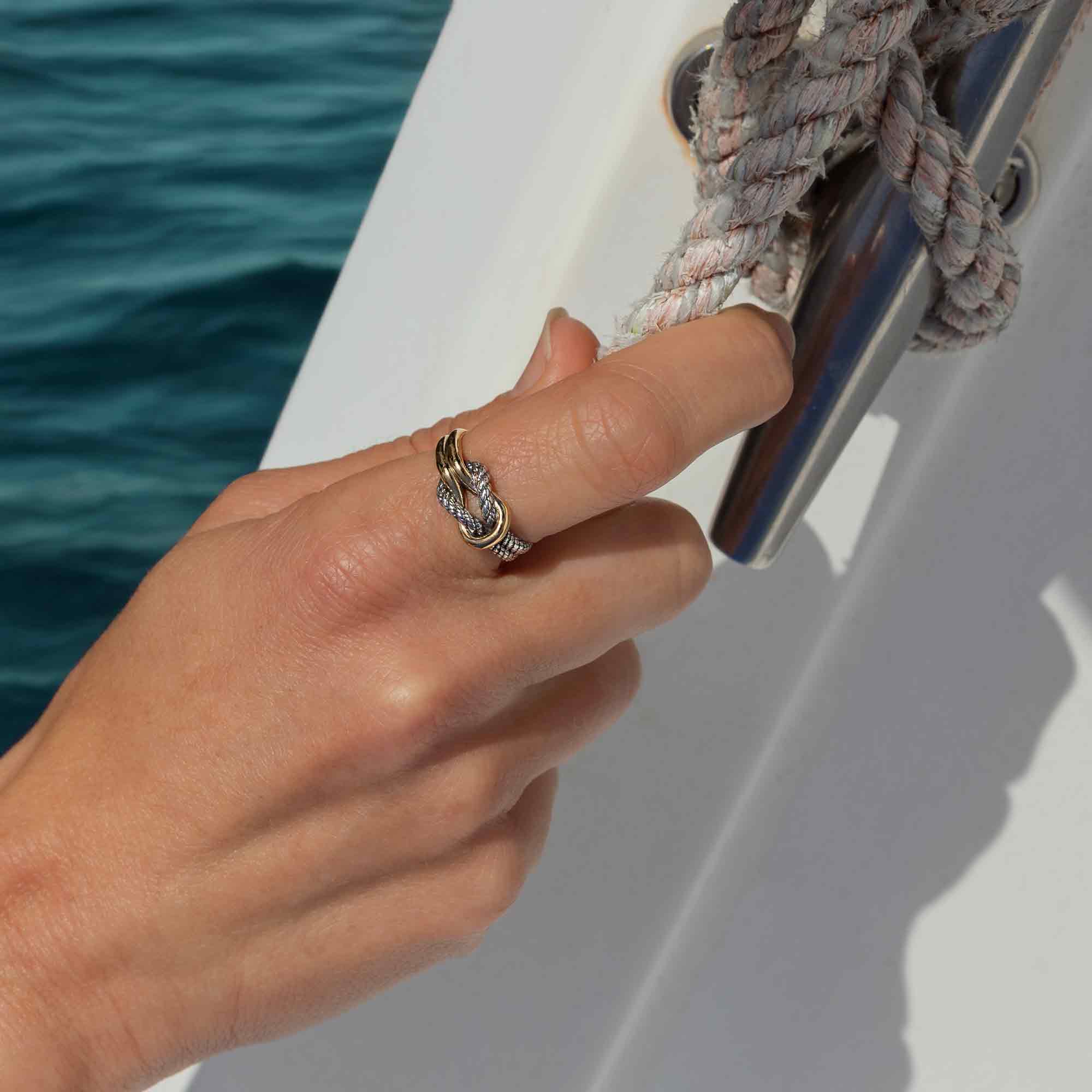 Celebrate strength and connection with our Mixed Metal Reef Knot Ring. This captivating design features a two-tone mix of warm bronze and cool sterling silver, intricately entwined to form a classic reef knot — a symbol of trust, unity, and enduring bonds. The contrast between the metals highlights the detailed rope texture and elegant craftsmanship, making this ring a statement of balance and harmony.