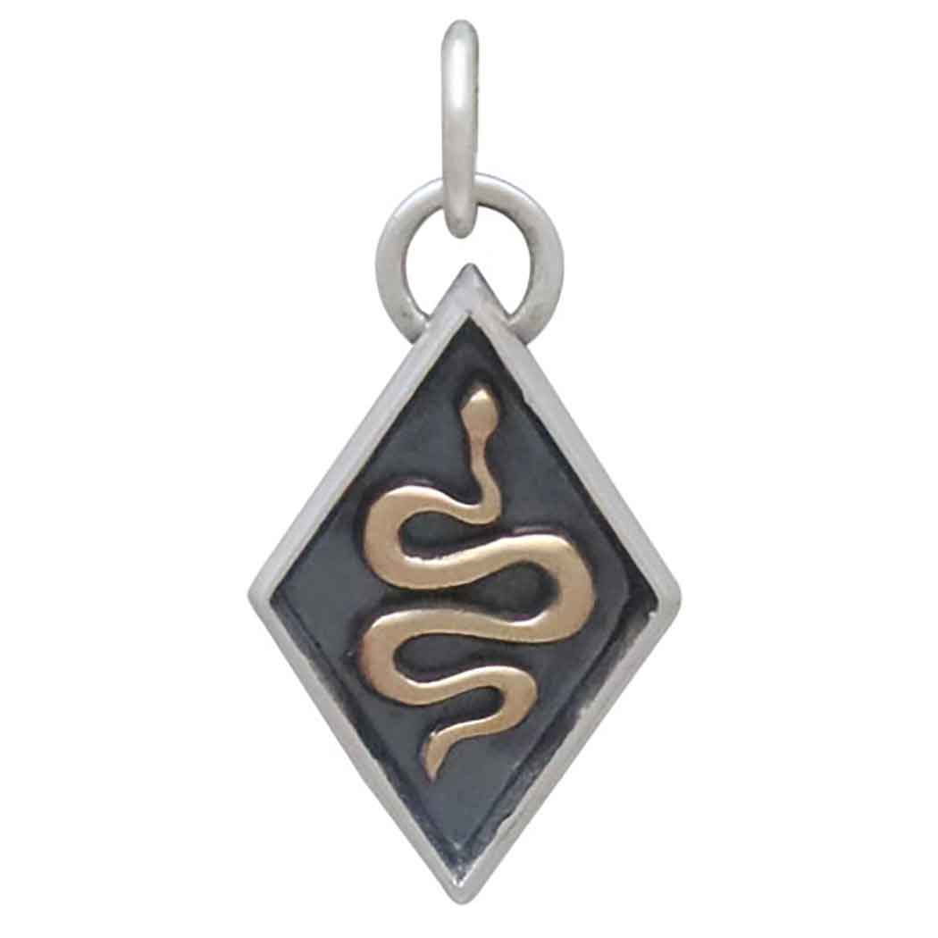 Mixed Metal Snake Shadow Box Charm. A tiny, bronze, slithering snake makes it way up a darkened, sterling silver diamond framed charm to add instant Gothic appeal to your jewelry line.
