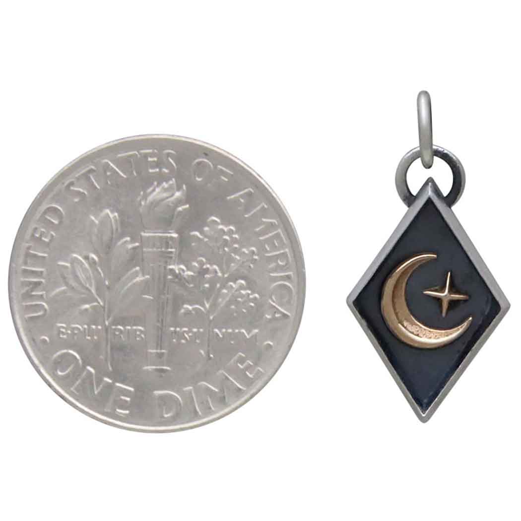 Offer your customers a picture of serenity & the night sky when you list this Mixed Metal Star and Moon Shadow Box Charm with other calming elements, like waves, lotus flowers, and other zodiac charms. The bronze moon and star elements rise prominently above the deeply oxidized surface in a sterling silver diamond frame making this petite charm a stand-out piece. Find many Moon Charms to add to your shop's selection.