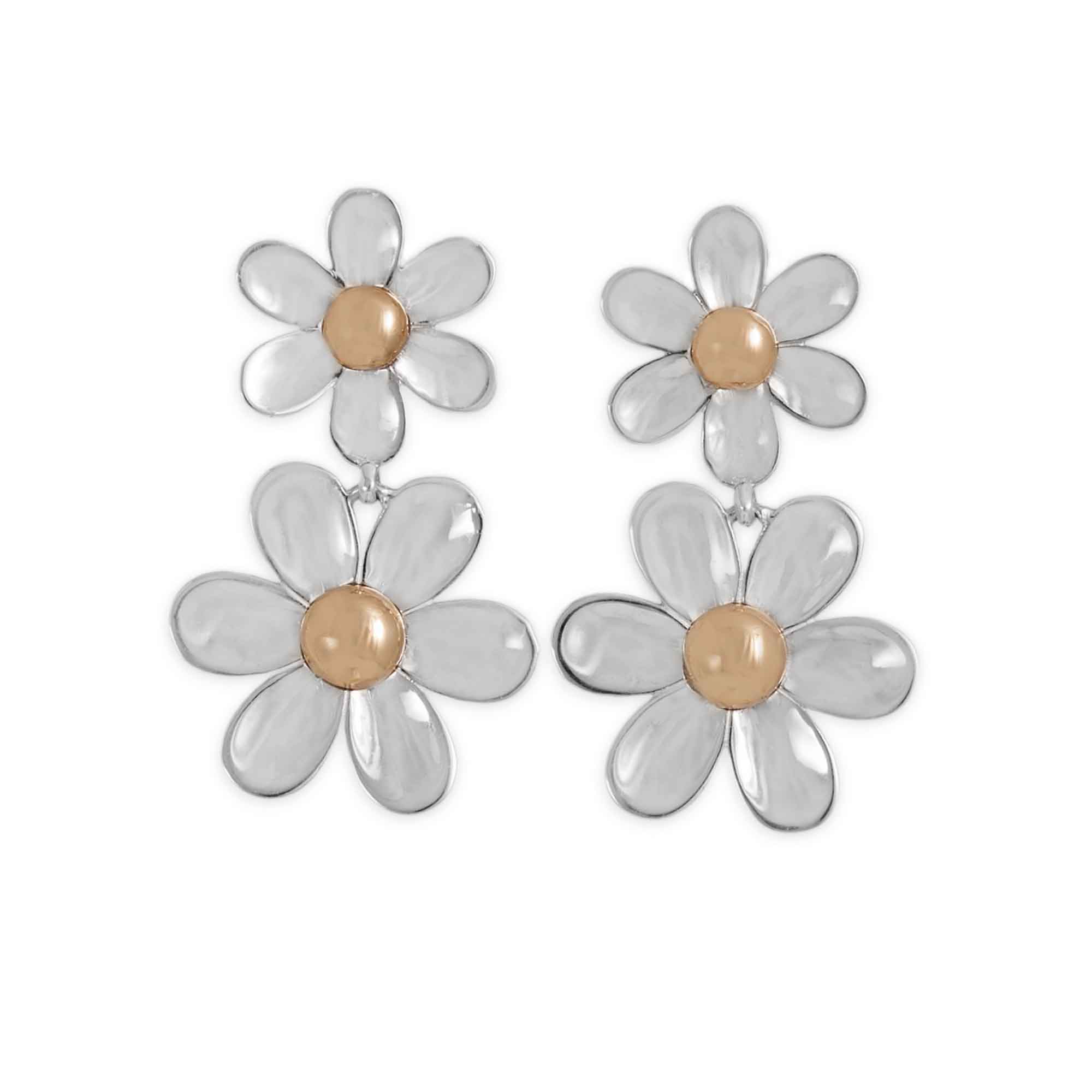 Bright and cheerful, these mixed metal two daisy dangle post earrings bring a playful botanical motif to a polished silhouette. Each earring features a pair of sculpted daisies arranged in a vertical drop, with softly contoured sterling silver petals surrounding warm bronze domed centers. The contrast of cool silver and golden bronze adds depth and dimension, making the floral design truly stand out.