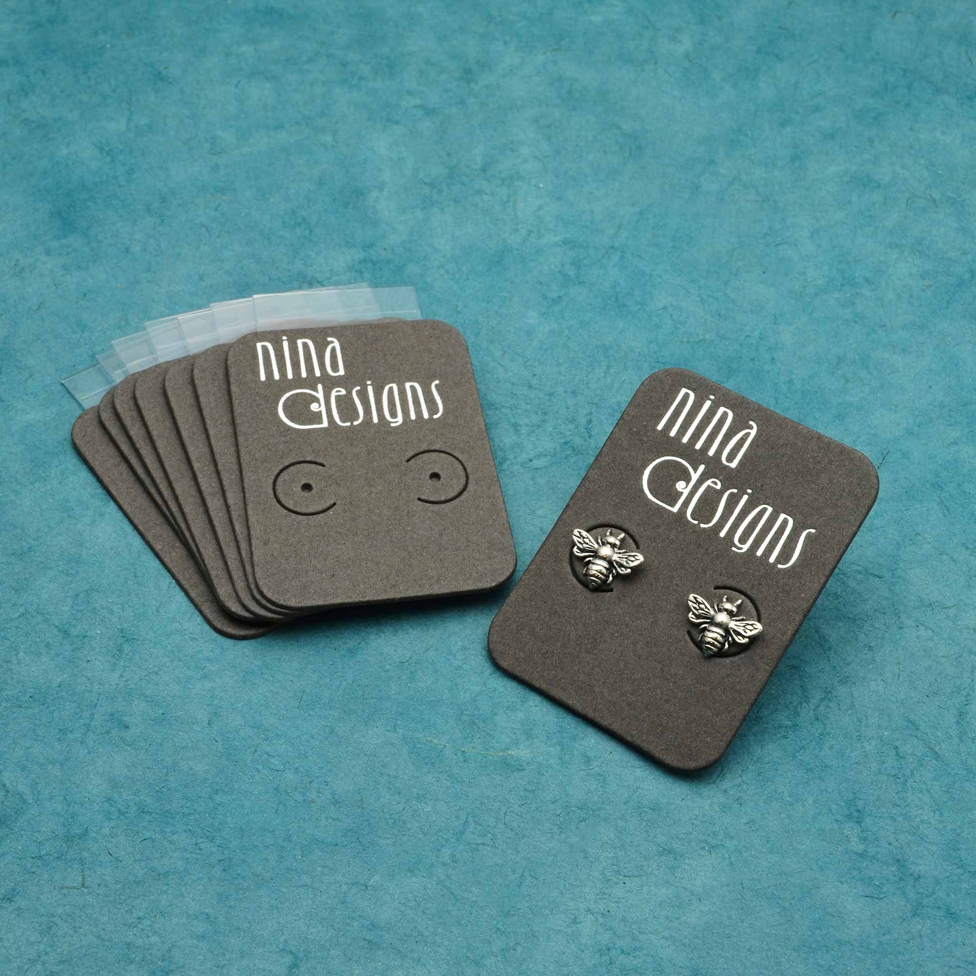 Easily display earrings in your shop with our Nina Designs earring cards! Our grey paper earring cards measure 2” x 1.5” and come with a lipped back so you can easily hang them on display racks. Earring cards are sold in packs of 20.