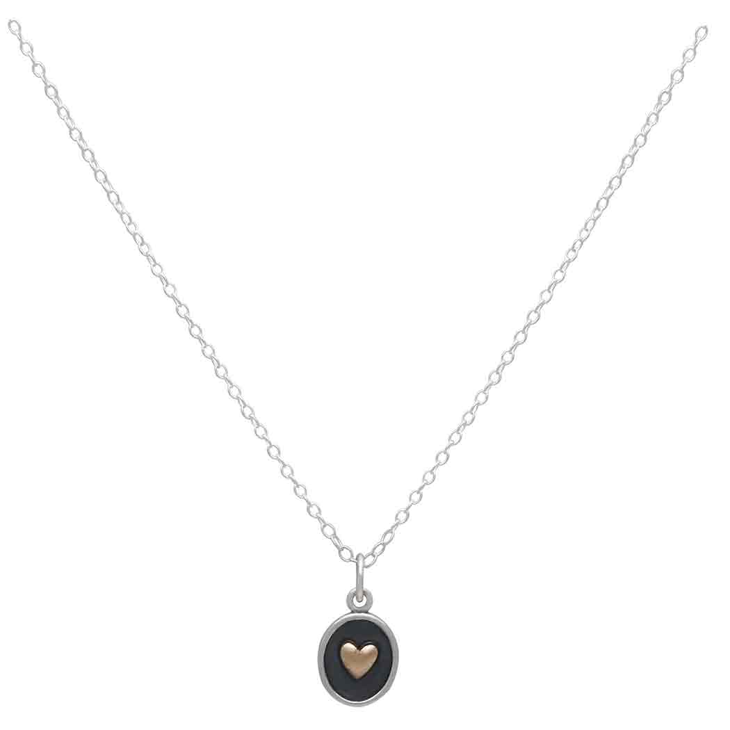 Sterling silver shadow box necklace with a bronze heart offers a romantic mixed metal look with quiet depth. A warm bronze puffy heart rests inside a dark oxidized oval frame, creating a dimensional shadow box effect. The layered finishes give this wholesale necklace strong visual contrast and an easy story for gift shops. Hearts symbolize love, affection, and emotional connection, making this design a natural fit for meaningful jewelry displays.
