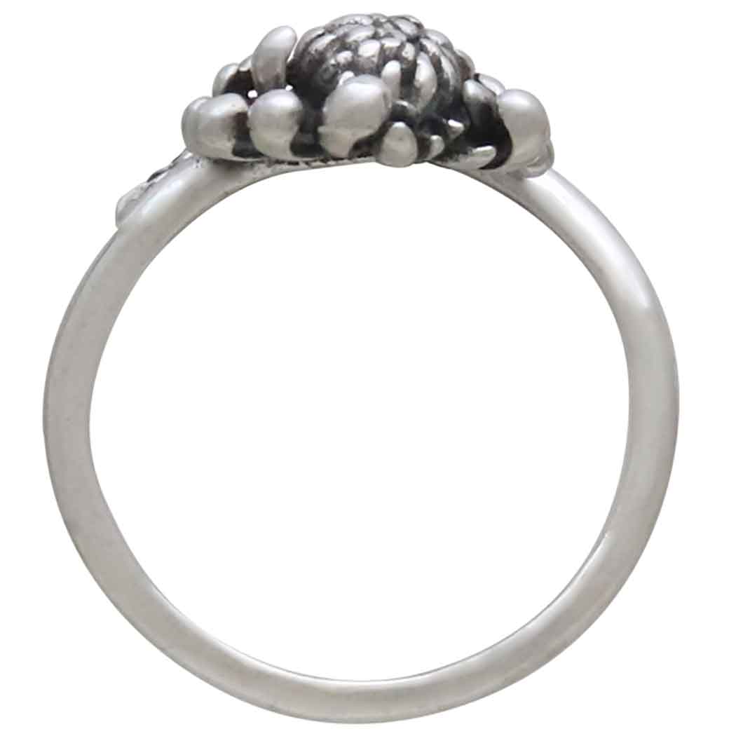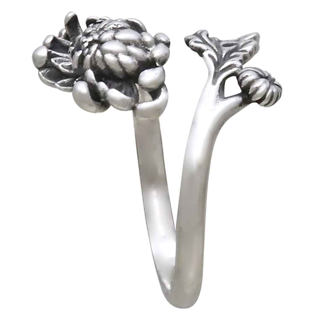 Celebrate November babies with sterling silver adjustable chrysanthemum ring - November's Birth flower. The bloom features numerous petals arranged in tight, concentric circles, creating a full, dome-like shape. The stem wrapping around the finger with a broad, serrated leave and a tight round bud. First cultivated in Asia, chrysanthemums are strongly associated with the fall season, and because of their perky petals have come to signify joy, friendship, youth, and longevity. Those born in November tend to be charismatic, the life of the party, and can reliably go the distance for those in need.
