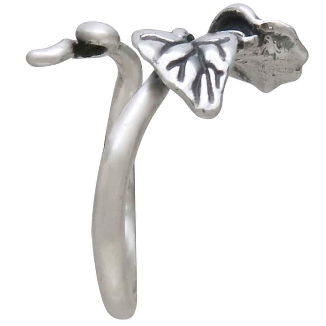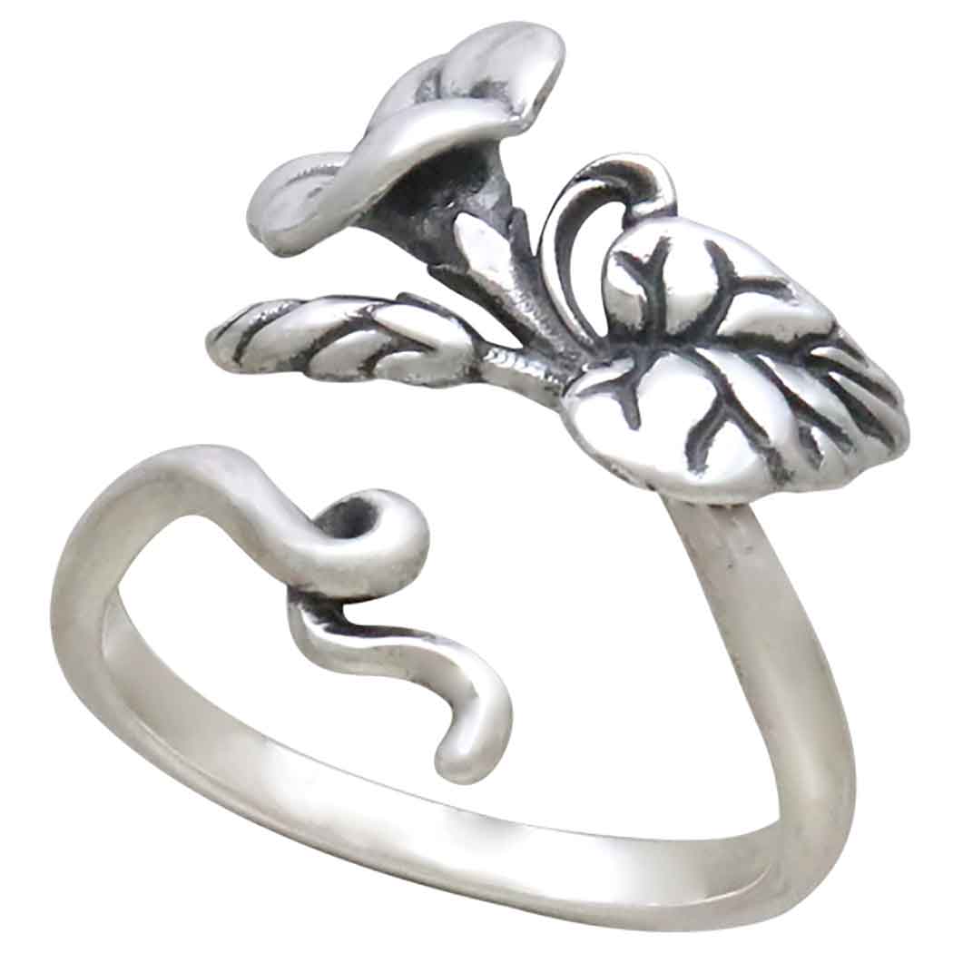 Celebrate September babies with sterling silver adjustable morning glory ring - September's Birth flower. This beautifully detailed ring features a delicate, trumpet-shaped flower adorned with a heart shaped leaf. Accompanying the bloom is a tightly coiled bud, hinting at the promise of new blossoms to come. The slender vine wrapping gracefully around the finger. Morning glories are sticklers about their routine, and they are hardy, tenacious growers. These qualities have made them symbols of ambition, desire, energy, and undying love. Our friends born in September tend to be friends for life, to easily earn our favor, and be our biggest supporters. Their easy, carefree energy is a joy to be around.