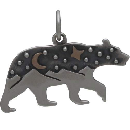 Sterling silver bear charm with mountains and bronze moon enchants with its magical, mystical dreamscape - perhaps even transporting you to an unfamiliar place of trance walking and ritual dances. Because of their fierce spirit, bears impart bravery to those who require it; but, because they prefer peace and tranquility, bears call for harmony and balance in the universe.