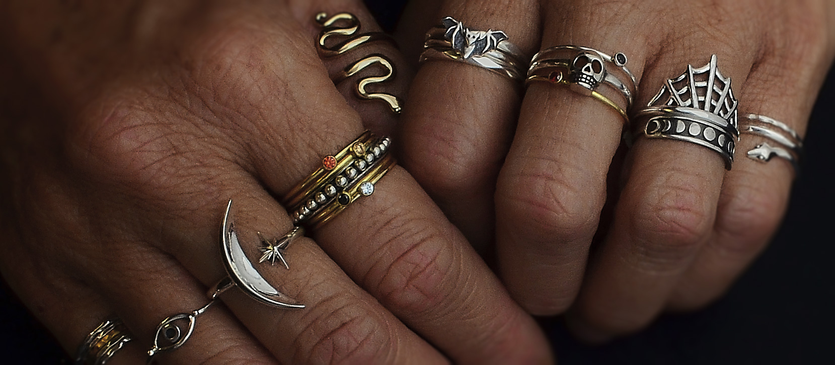 The collection includes sterling silver rings plus select bronze and mixed metal rings. Some rings are offered in gold plated finishes.