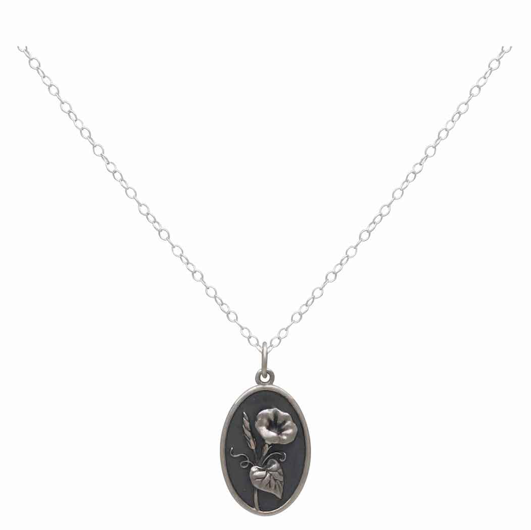 Celebrate September babies with sterling silver morning glory necklace - September's Birthflower. Morning glories are sticklers about their routine, and they are hardy, tenacious growers. These qualities have made them symbols of ambition, desire, energy, and undying love. Our friends born in September tend to be friends for life, to easily earn our favor, and be our biggest supporters. Their easy, carefree energy is a joy to be around.