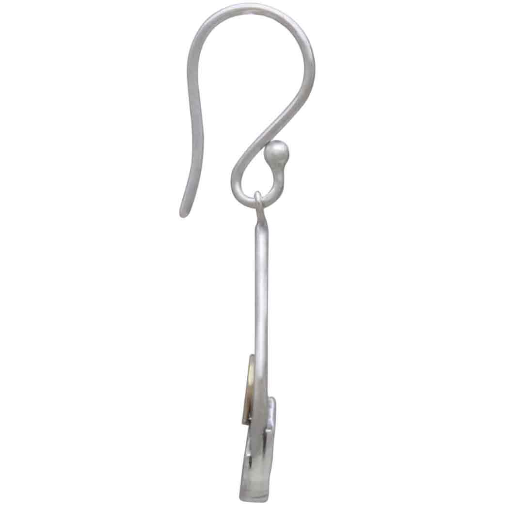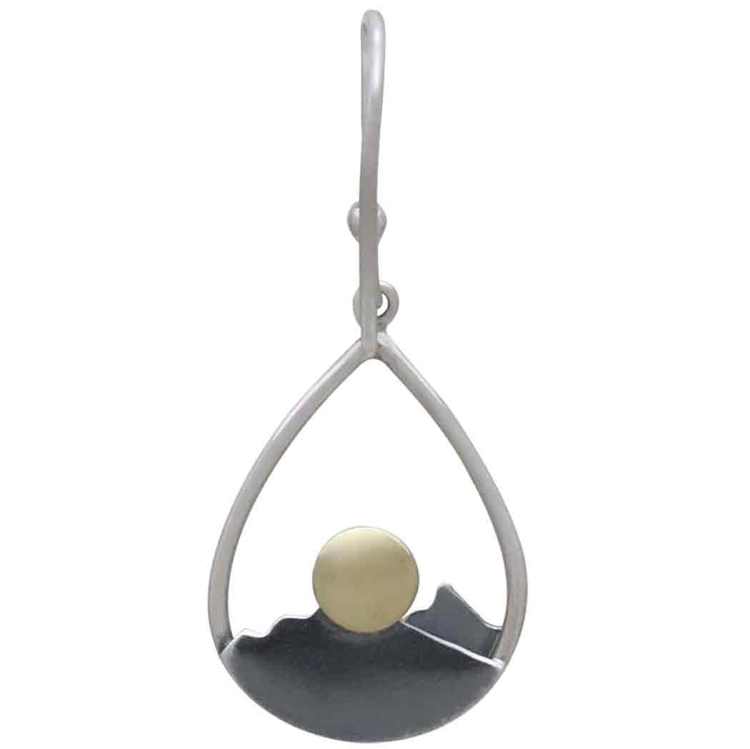 These silver mountain teardrop earrings with bronze sun feature a hammered finish mountain range, oxidized details and a warm bronze sun rising and setting in the distance. Oxidized detailing gives this cutout piece dimension, enhancing the jagged mountain tops.