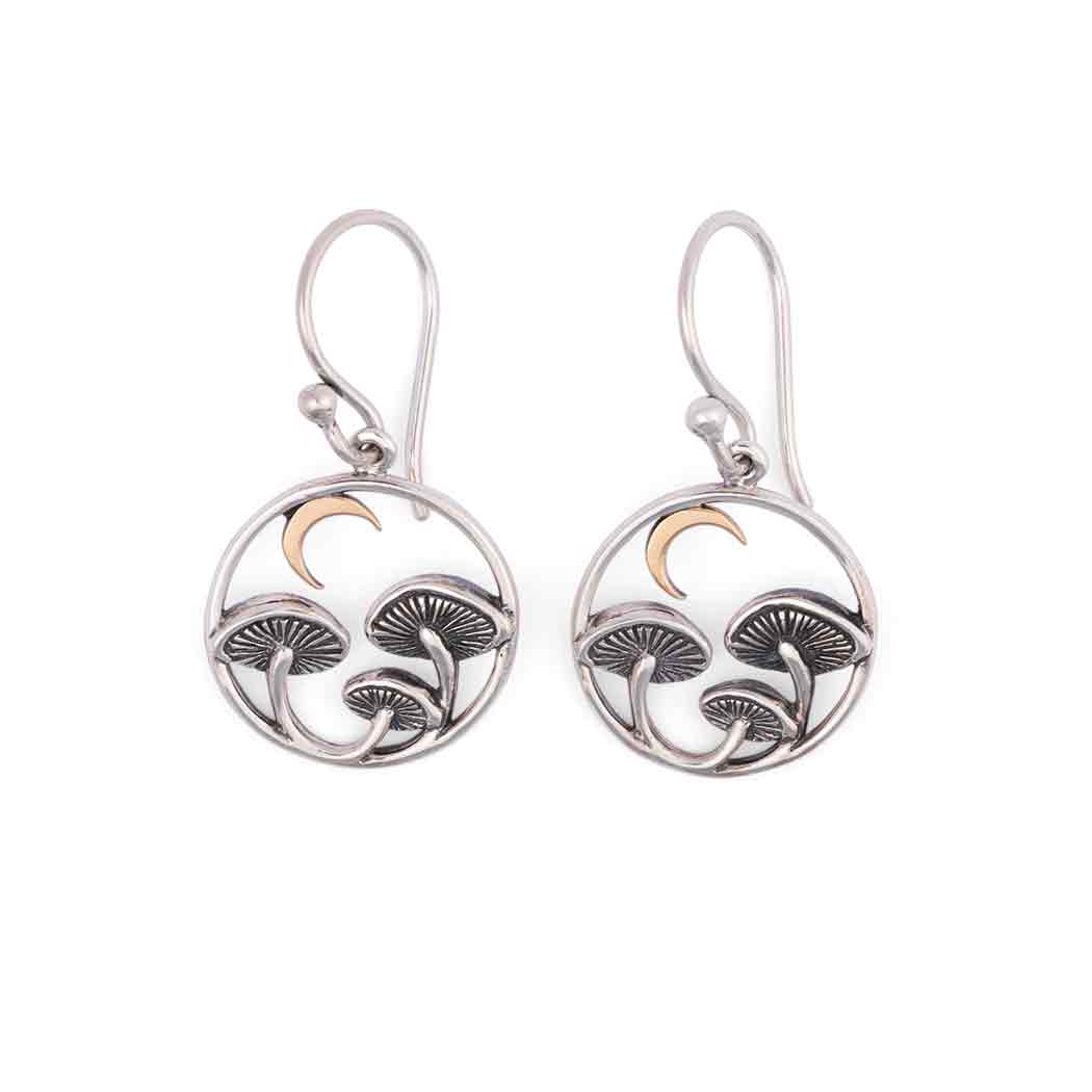 These sterling silver mushroom dangle earrings with a bronze moon will transport you to a far away land where anything can happen. Featuring three beautifully detailed sterling silver mushrooms in a circle frame with the warmth of the bronze moon above. Its fairy tale qualities are truly delightful. Makes a great gift for avid readers, and imaginative creatives in your life.