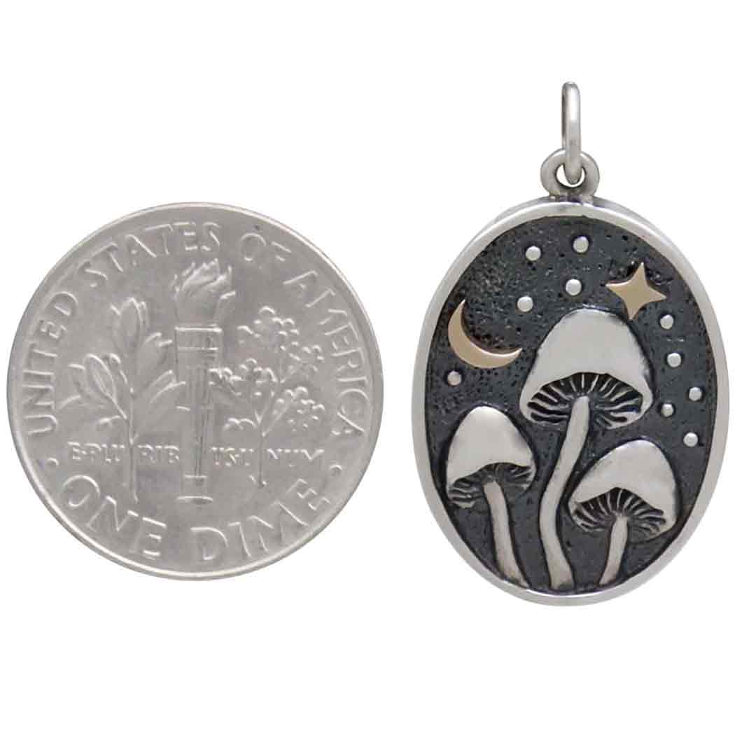In this sterling silver mushroom pendant with bronze star and moon we hope to transport you and your customers into a magical realm where fairies dance, witches cast spells, and gnomes misbehave. In an oval frame we set a nighttime scene where three little mushrooms stretch out toward moon and stars, transforming dead matter into fertile soil. Mushrooms are nature's recyclers where old becomes new, and fairy tales' mischief makers where good becomes naughty. For centuries the sudden eruption of circles of mushrooms from the soil led people to believe dark and terrible forces were at work. "Earthly vapours," lightning strikes, fiery tails of dragons, witches and sorcerers have all been blamed.
