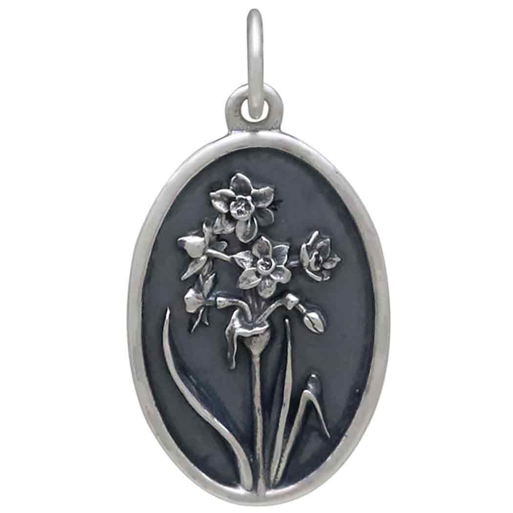 Celebrate December babies with sterling silver narcissus charms - December's Birthflower. The paperwhite narcissus produces fragrant white blossoms whose petals are as delicate as paper. It is said to represent purity, faithfulness, and respect. In Victorian times, gifting a paperwhite meant "you're the only one." Those born in December tend to be loyal friends, who are big hearted and ease into leadership roles.