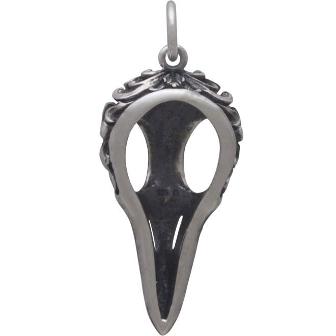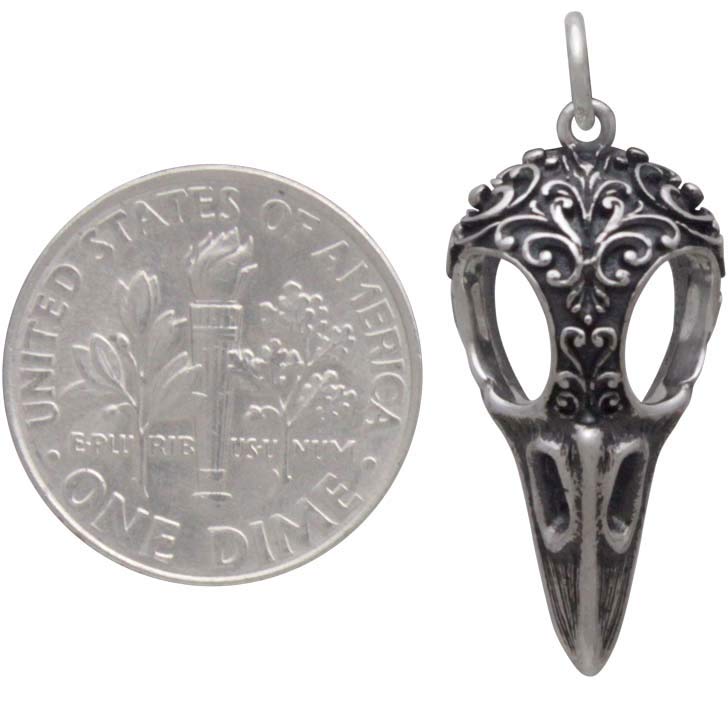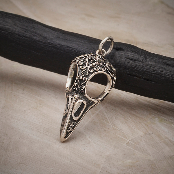 The beauty of this sterling silver raven skull charm with scroll carving will cast a spell on you. All the details from the lined ridges of the beak to the fanciful scroll work crowning the skull distinguishes this raven skull charm from others.