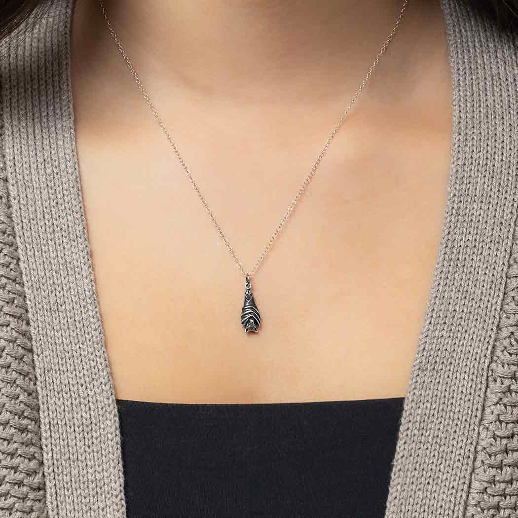 Flaunt your darker side with sterling silver 18 inch hanging bat necklaces. With her wings wrapped around herself like a cloak, this little bat is taking a long deserved rest. These bats are lovely from all sides - the ribbed wings wrap from front to back, and she has a sweet face with a long nose and pointy ears.