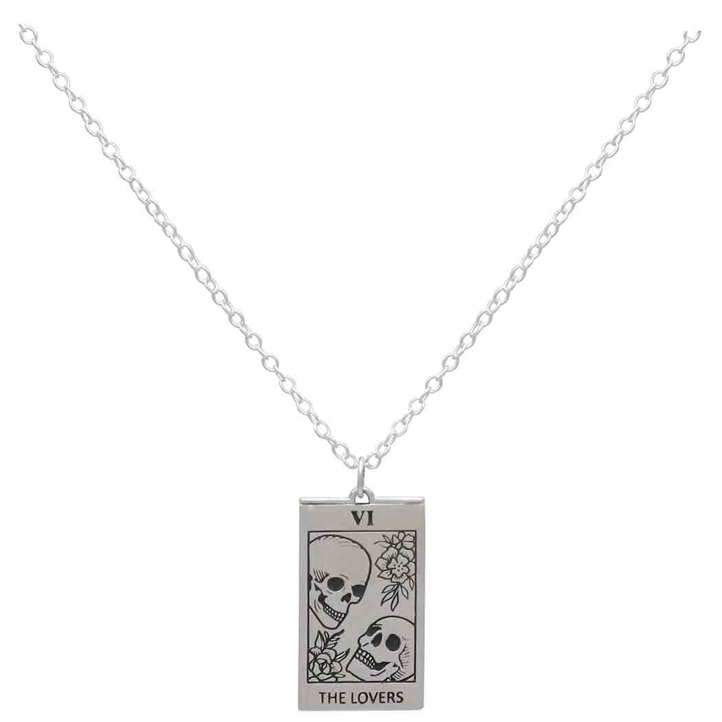 This sterling silver 18 inch lovers tarot card necklace depicts the skulls of two lovers who are held in a loving gaze & framed by roses. You get the sense these are two lovers who have spent their lives honoring one another. The primary meaning of the the Lovers is harmony and attraction. The trust they share imparts strength and confidence. One empowers the other. Sometimes in readings the lovers can indicate a difficult choice needs to be made. At other times, the lovers signify a need to develop our own personal belief system & values, regardless of societal norms and pressures. Love is often about being true to your self, so you can be genuine and authentic to the people around you. Be brave.