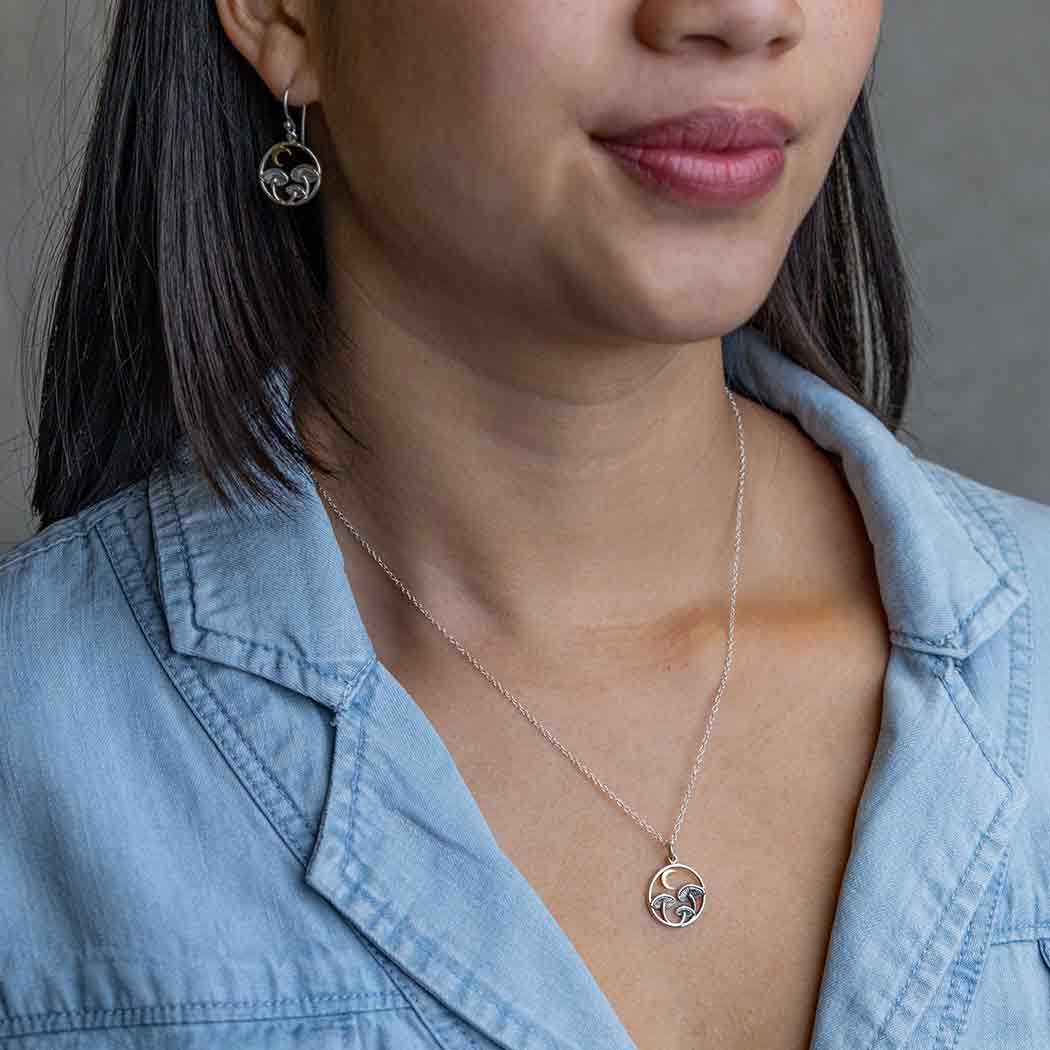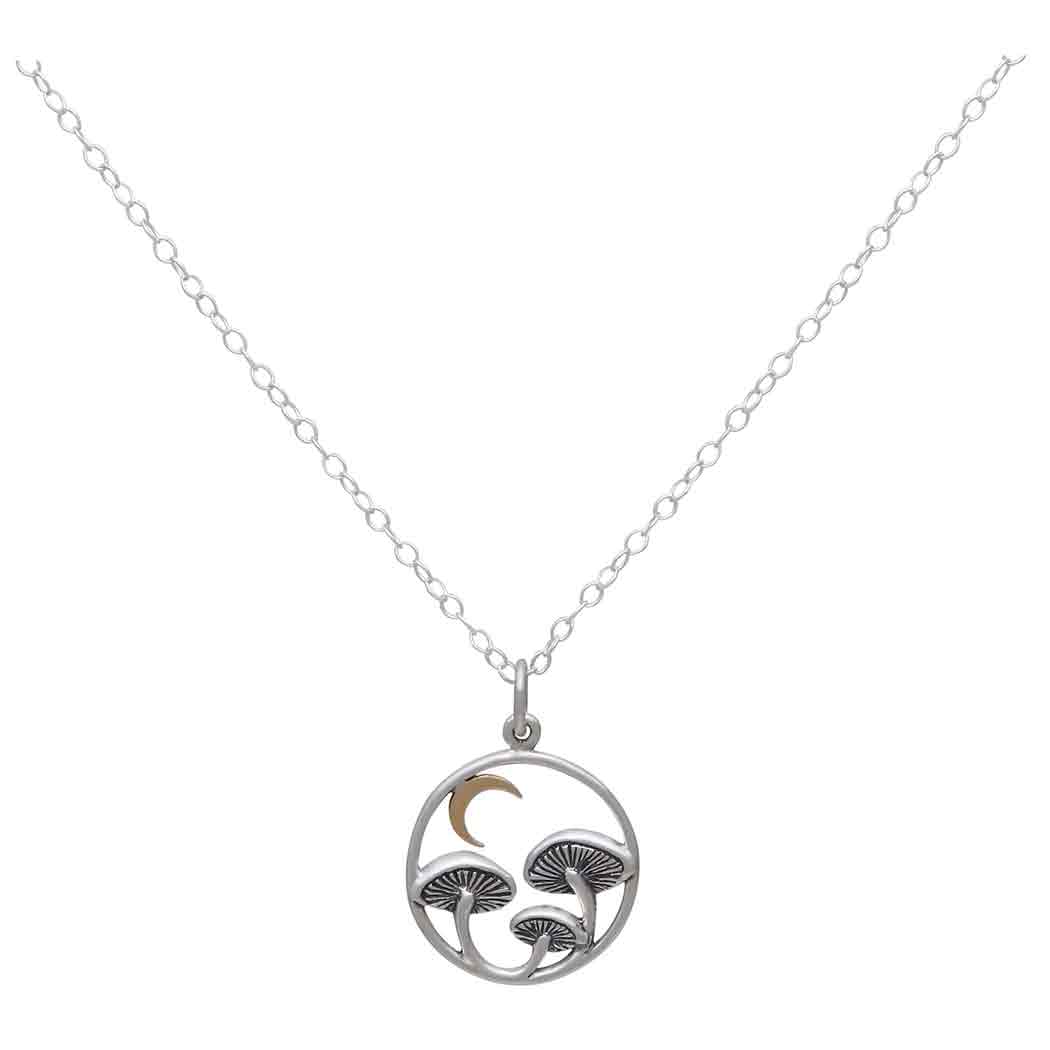 Sterling silver mushroom necklace with a bronze moon brings quiet enchantment to wholesale necklaces and symbolic jewelry displays. Featuring three beautifully detailed sterling silver mushrooms in a circle frame with the warmth of the bronze moon above. Its fairy tale qualities are truly delightful. This woodland design speaks to healing, vitality, imagination, and the wonder of hidden places. It is an easy choice for boutiques seeking fairy tale jewelry, mushroom jewelry, and mystical nature gifts.