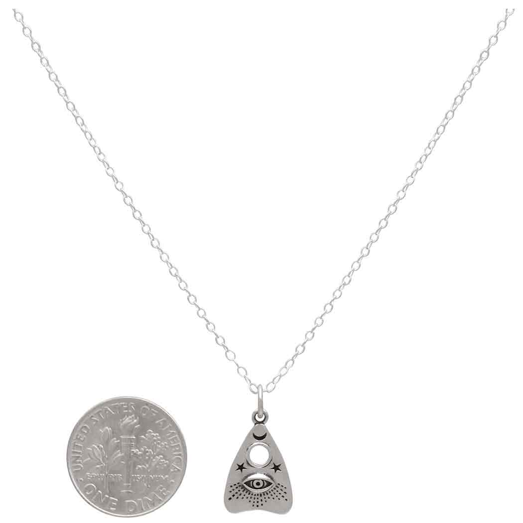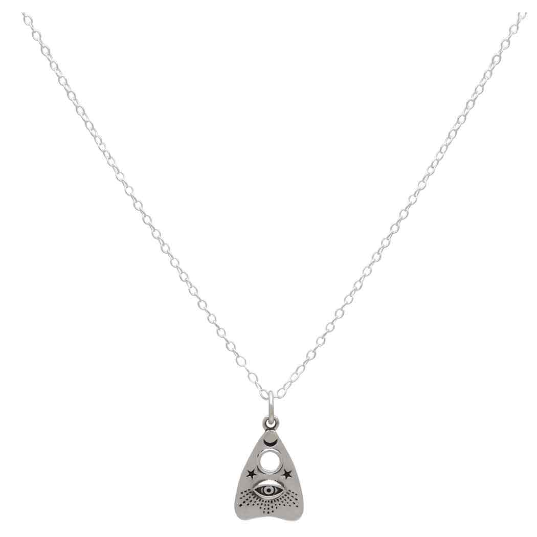 Those fascinated with the occult will be delighted by this sterling silver 18" Ouija planchette charm necklace with all-seeing eye. It features details you might find on the real thing, like tiny stars & moon, the hole for selecting letters, and an all-seeing eye.