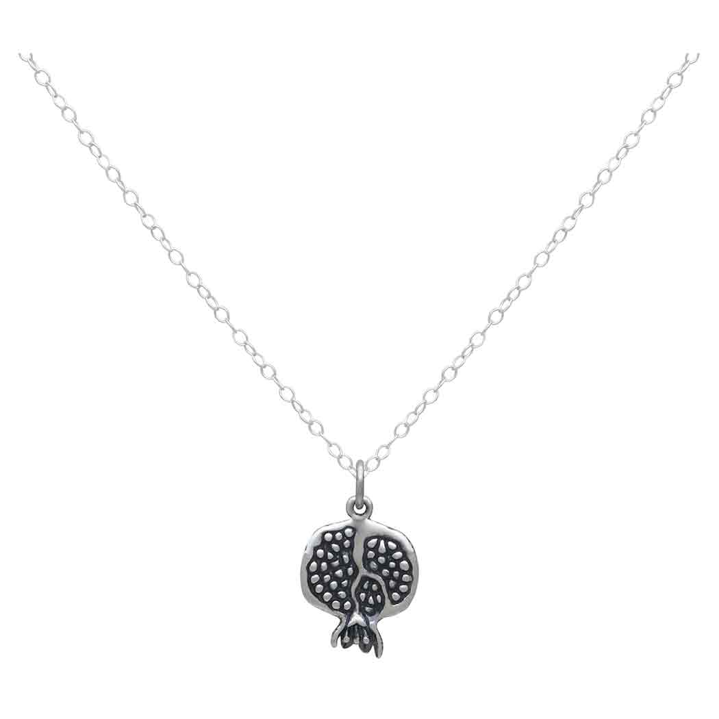 Create a luscious jewelry line when you add this sterling silver 18 inch pomegranate charm necklace to your shop. One look at pomegranate's juicy interior and you know why this is the fruit Hades chooses each year to lure Persephone back to the underworld. In some religious texts, the pomegranate is said to be the forbidden fruit in the Garden of Eden rather than the apple.